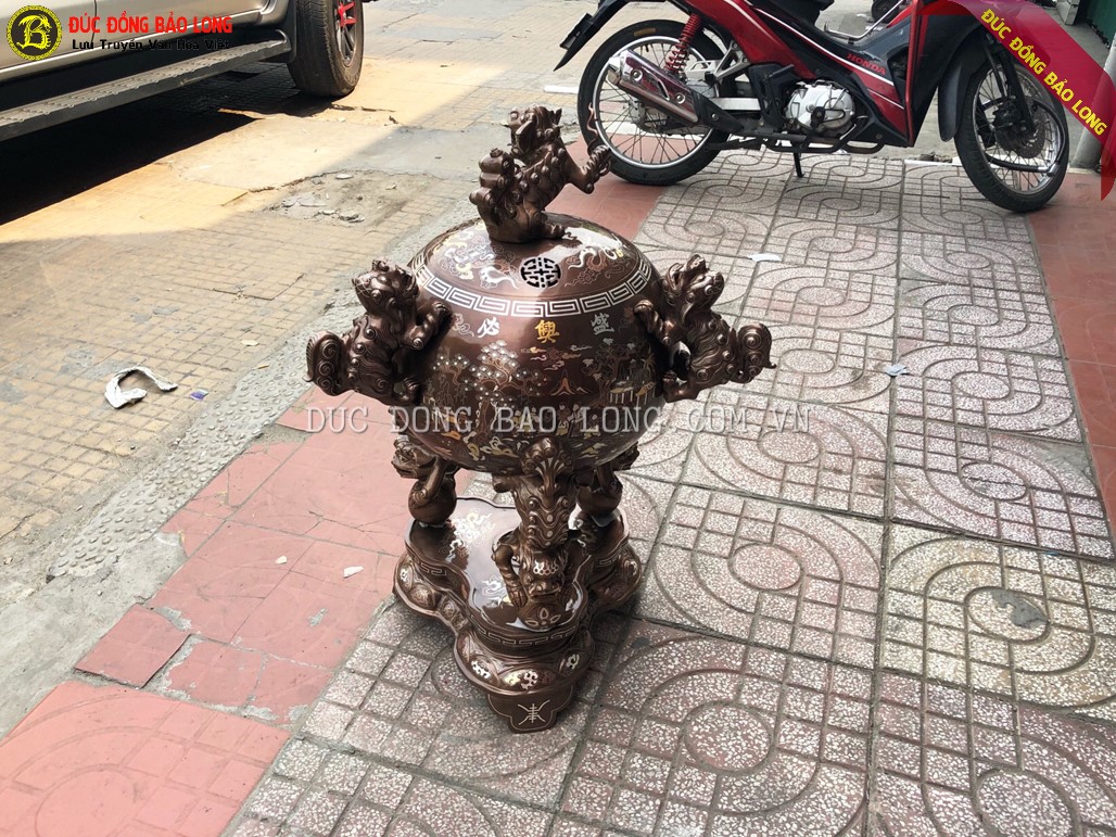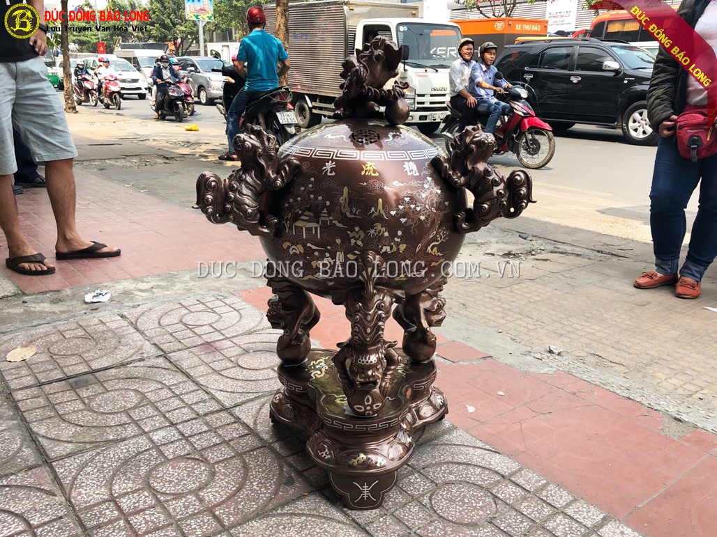 Cơ sở Đúc Đồng Bảo Long chế tác hoàn thiện Đỉnh Thất Lân Vờn Cầu 1m1 khảm tam khí cao cấp cho khách ở Quận Thủ Đức - TPHCM. Đỉnh cao 1m1, bầu rộng chừng 52cm, nặng chừng 1,1 tạ đồng nồi đã được chuyển đến tận tay khách hàng an toàn.