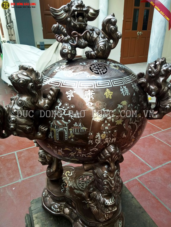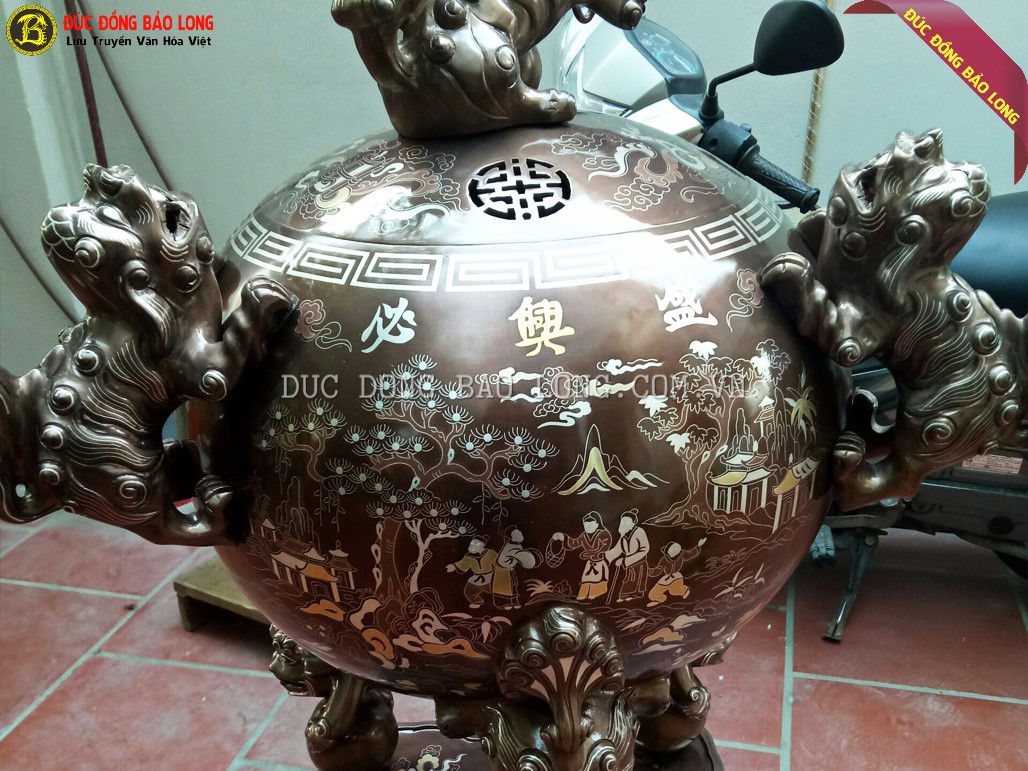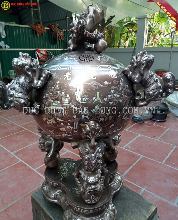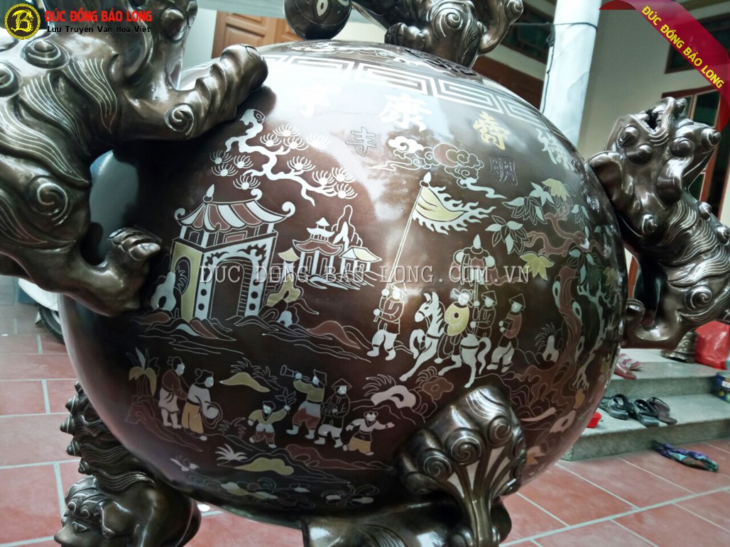Đỉnh Thất Lân Vờn Cầu 1m1 Khảm Cao Cấp gồm 3 tích khảm chạy theo chiều kim đồng hồ quanh bầu đỉnh thành vòng khép kín, các tích có sự liên quan ăn nhập với tích còn lại nên được gọi là khảm chan tích vinh quy bái tổ khép kín.