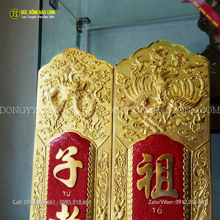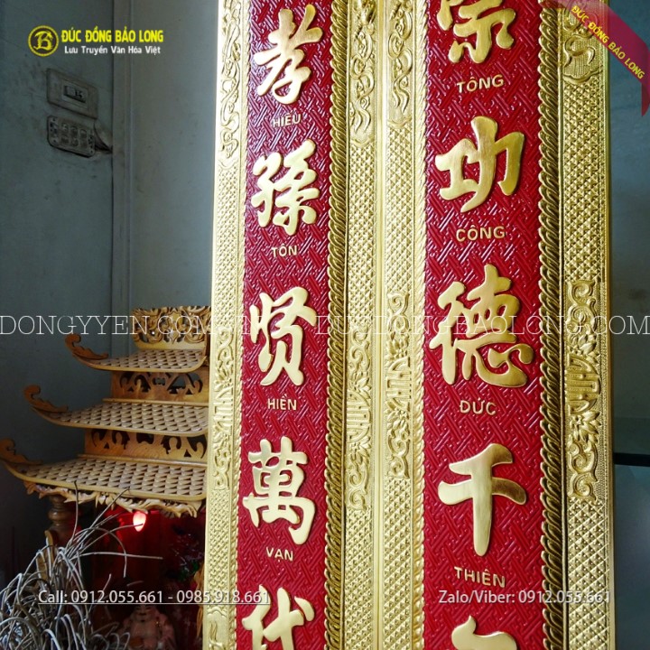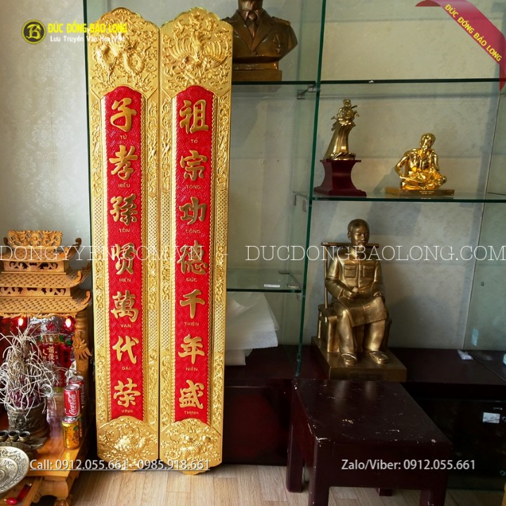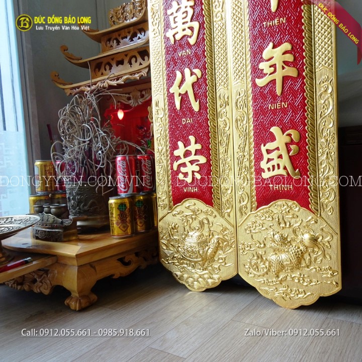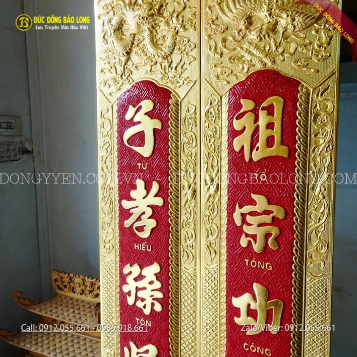 Đôi câu đối bằng đồng thờ gia tiên mạ vàng 24k mang những dòng chữ: "Tổ Tông Công Đức Thiên Niên Thịnh/Tử Hiếu Tôn Hiền Vạn Đại Vinh" thường đi với Cuốn Thư Câu Đối "Đức Lưu Quang". Sản phẩm được các nghệ nhân của Bảo Long chạm bằng tay từ nguyên liệu đồng vàng nhập khẩu Hàn Quốc, đồng dày 8rem, có sẵn móc treo rất chắc chắn giúp câu đối định vị trên tường không bị lung lay. Hàng chạm tinh xảo, sắc nét, chữ được thúc nổi và nền được tô màu đỏ. Bộ câu đối này được mạ phủ vàng ròng 24k bằng phương pháp điện phân nhúng bể cao cấp nhất hiện nay cho màu sắc rực rỡ và độ bền gần như không thay đổi theo thời gian.