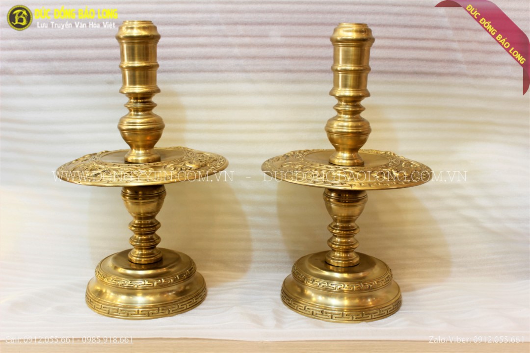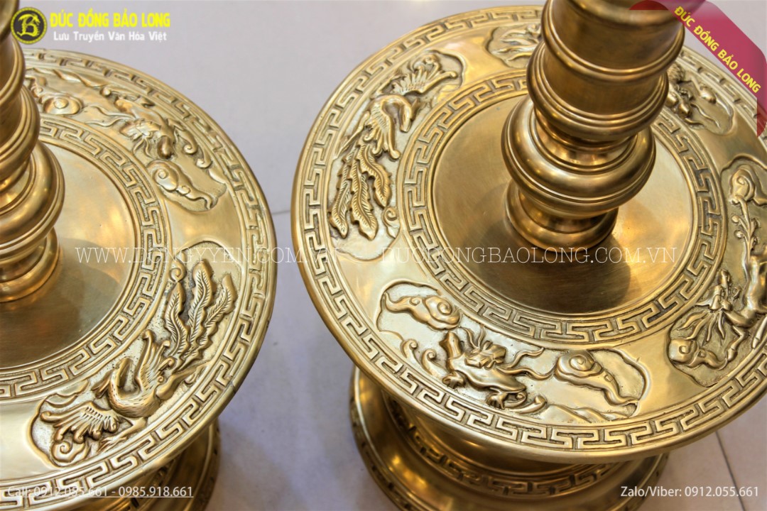 Đôi chân nến được đúc hoàn toàn thủ công theo phương pháp truyền thống, nguyên liệu là loại đồng catut - đồng vỏ đạn, loại đồng tốt nhất hiện nay được nhập khẩu tại các đơn vị quân sự ở Nga. Sản phẩm được đúc nổi hình tứ linh, các nghệ nhân đã mài dũa, tỉ tót nên hoa văn rất sống động, đẹp mắt.