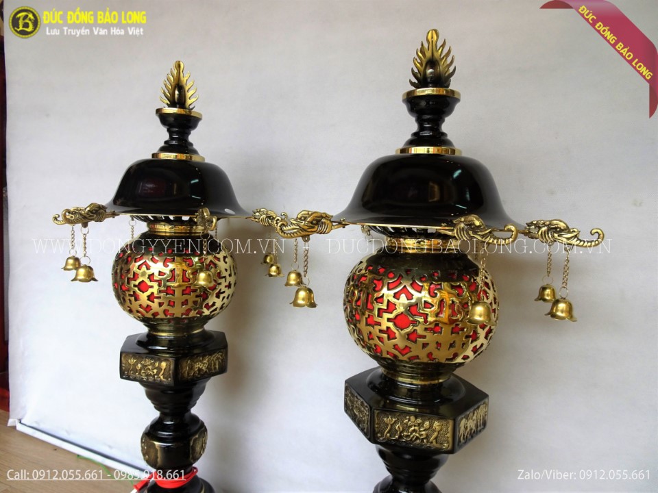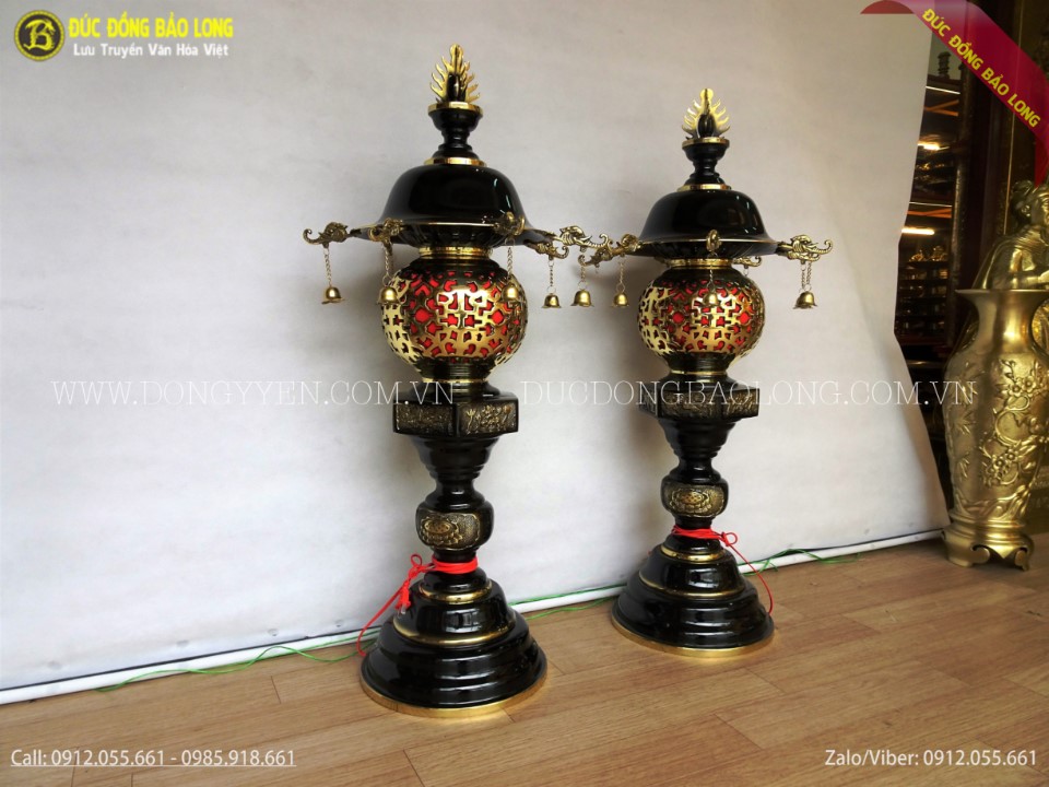 Đôi đèn bằng đồng vàng đen cao 90cm là sản phẩm được đúc bằng đồng công nghệ Đài Loan, đúc bằng đồng vàng, màu vàng đen sáng bóng, trên vành đèn có lắp chuông, có thể tháo rời. Sản phẩm có kích thước cao 90cm thường dùng để trong các ddienj, phủ, nhà thờ hoặc nhà chùa.