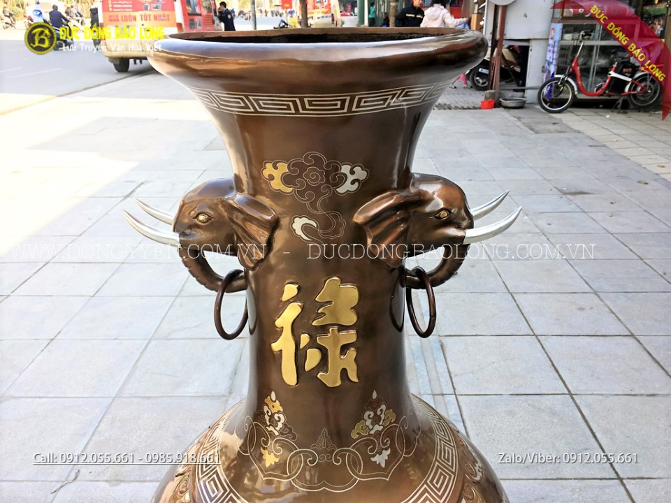 Đây là đôi lộc bình Phúc Lộc Thọ tai voi cao 1m27 rất hiếm, hàng cao cấp nhất trên thị trường hiện nay. Đôi lộc bình được đúc hoàn toàn thủ công từ đồng nồi hè, đúc dày dặn, đúc nổi 3 cảnh phúc lộc thọ rất tinh xảo, sắc nét. Đôi lộc bình tai voi ngoài việc được đúc bằng loại đồng đắt nhất mà chúng tôi tiến hành khảm tam khí cao cấp bằng các kim loại quý như khảm vàng, bạc 925, đồng đỏ. Màu của sản phẩm được tiến hành quét màu nước có chứa 6 loại hóa chất đặc biệt, phản ứng hóa học đã phân tách màu của từng kim loại quý trả về đúng như màu thật. Chúng tôi tiến hành dát vàng 9999 với 4 chữ lớn trên cổ bình, 4 chiếc ngà voi được bọc bạc miếng 925 rất dày.