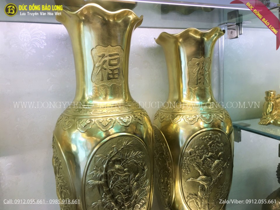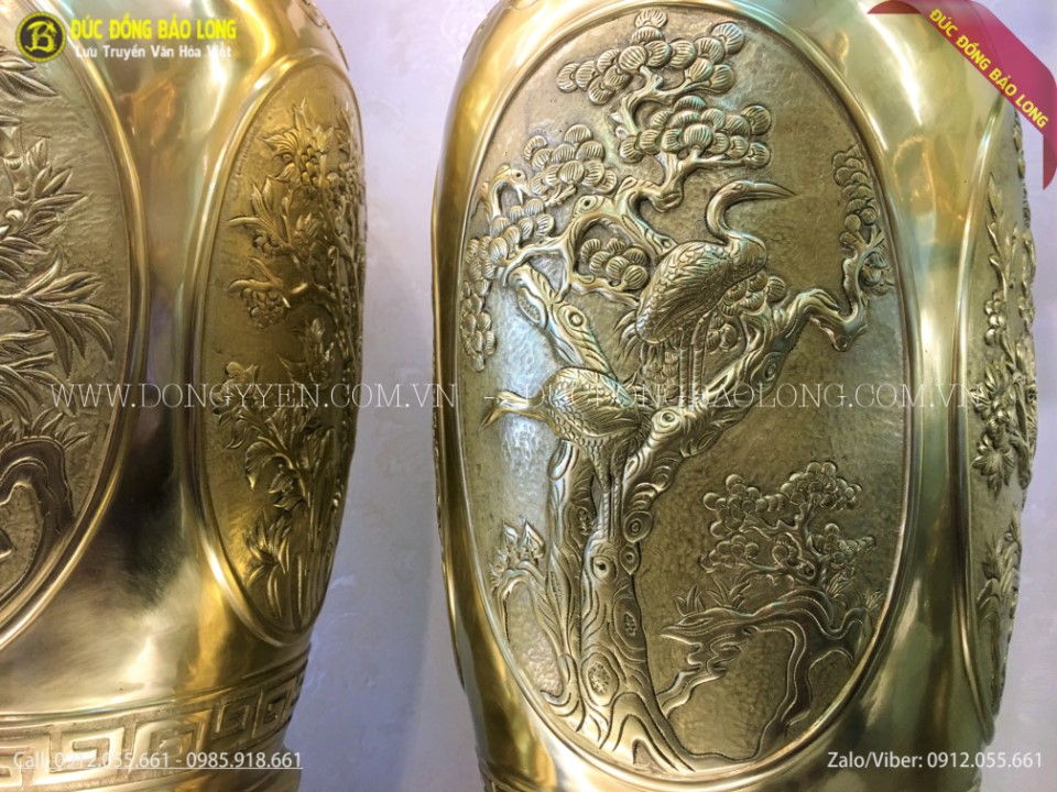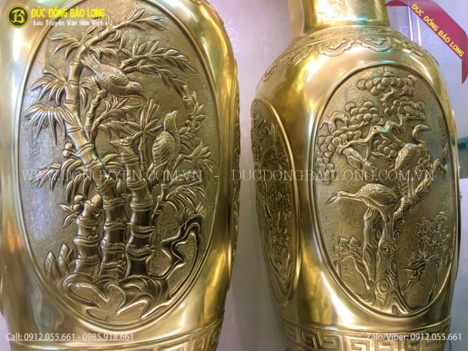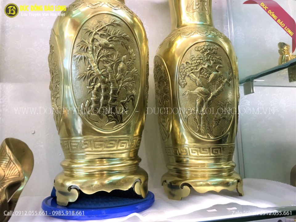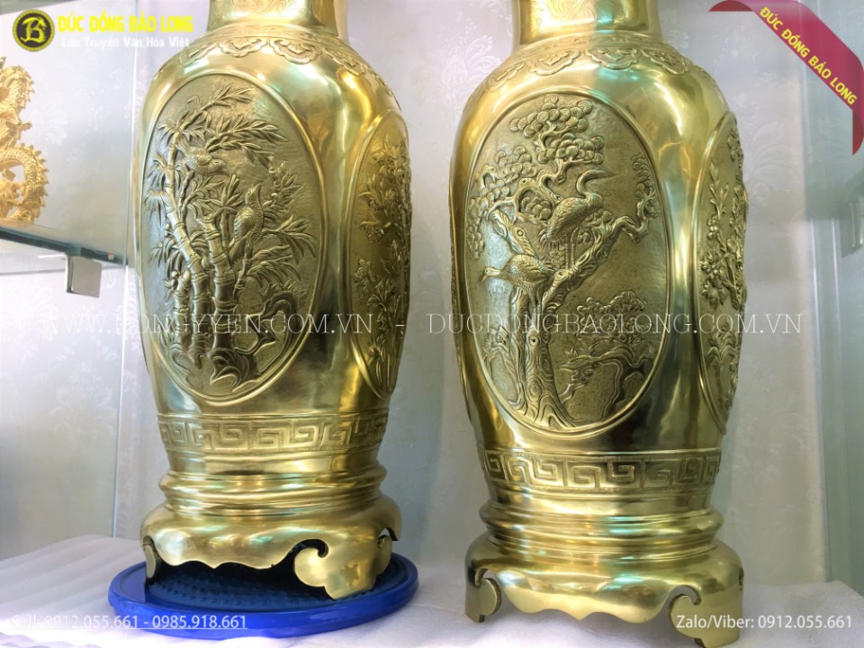 Đôi lộc bình tứ quý bằng đồng catut cao 70cm là siêu phẩm tuyệt đẹp được chế tác từ những chiếc vỏ đạn catut được nhập khẩu từ các đơn vị quân sự tại Liên Xô. Đó là đôi lọ hoa tứ quý - một trong những mẫu lọ hoa không quá xa lạ với những người chơi đồ cổ, nhưng chúng tôi đã chế tác theo một phong cách hoàn toàn khác, đúc dày dặn và chạm hoa văn tinh xảo hơn. Đôi lọ hoa được đúc hoàn toàn thủ công theo phương pháp truyền thống, nguyên liệu catut là loại đồng tốt nhất hiện nay cho sản phẩm có màu sắc ánh xanh đặc trưng, độ bền màu cực cao. Từng đường nét hoa văn hiện ra rất tinh xảo, ngay ngắn đầy sinh động nhờ những đường ve búa điêu luyện kết hợp với tài hoa của nghệ nhân sửa nguội. Mỗi lọ hoa mang theo 2 cảnh Tùng - Cúc và Trúc-Mai bố trí theo lối canh cảnh nối cảnh bao quanh 4 mặt của lọ hoa, mặt chính của Lọ là cảnh Cúc và Mai, cổ lọ có 2 chữ Phúc và Lộc nằm đối xứng nhau, dưới chữ có chạm nổi viền cánh hoa, 3 chân khánh của lọ là chữ Thọ.