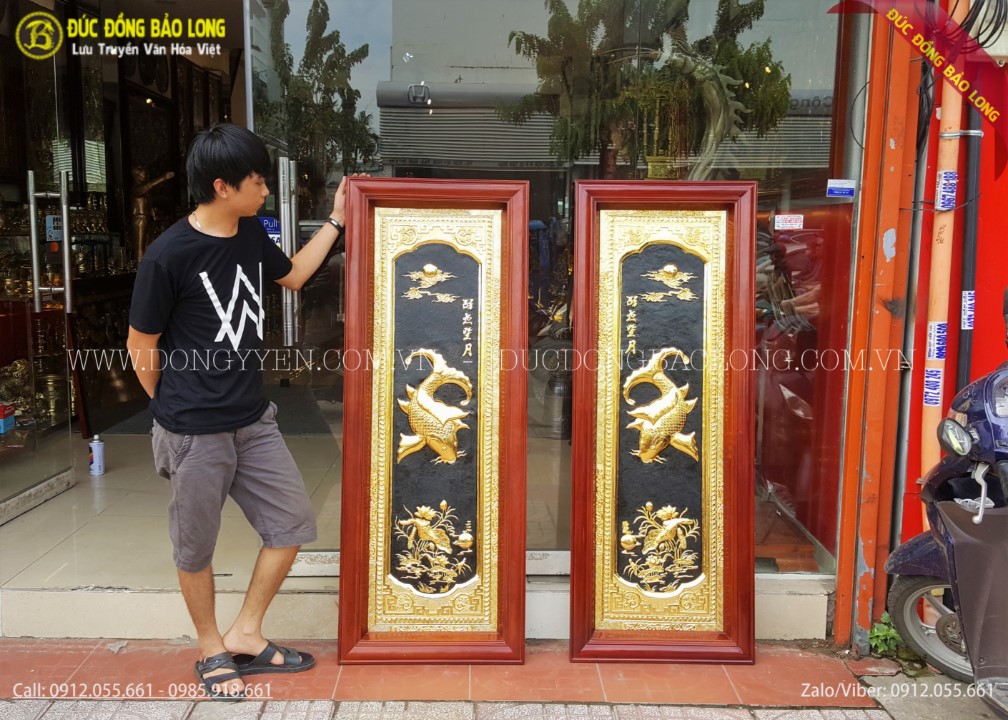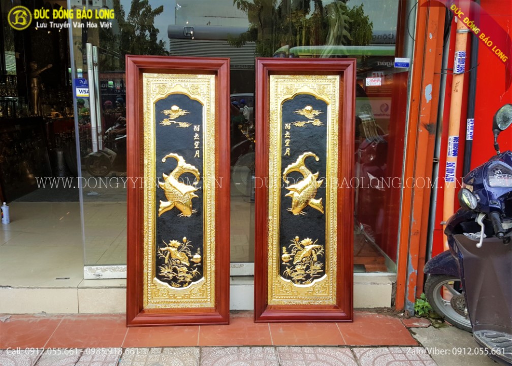 Đôi tranh cá chép trông trăng do đội ngũ nghệ nhân của Bảo Long tâm huyết chế tác hoàn toàn thủ công từ chất liệu đồng nguyên tấm được nhập khẩu từ Hàn Quốc, đồng dày 8rem. Tranh được chạm tinh xảo đôi cá ché, dưới ánh trăng, viền hạ bậc đẹp mắt tạo chiều sâu cho bức tranh, khung gỗ trò chỉ loại tốt được tuyển chọn ký lưỡng đảm bảo vân gỗ đẹp, không bị lỗi, màu cánh dán sáng. Tranh sau khi chạm tinh được xử lý rất kỹ bề mặt đảm bảo không còn tạp chất trước khi chuyển quan khâu mạ vàng. Tranh được mạ phủ vàng ròng 24k bằng phương pháp điện phân nhúng bể cao cấp cho bức tranh có màu vàng tươi, sáng bóng sang trọng và đặc biệt độ bền cực cao.