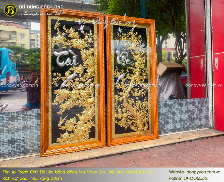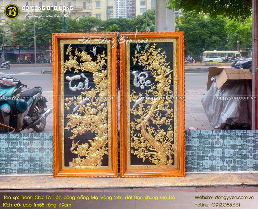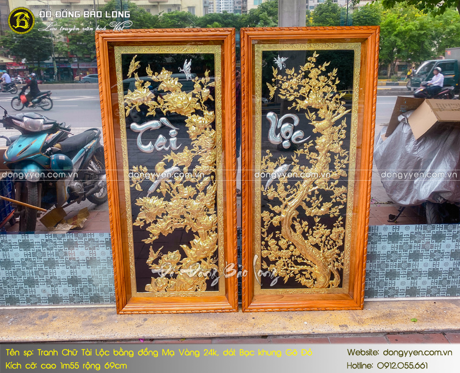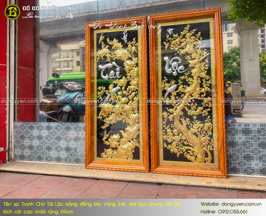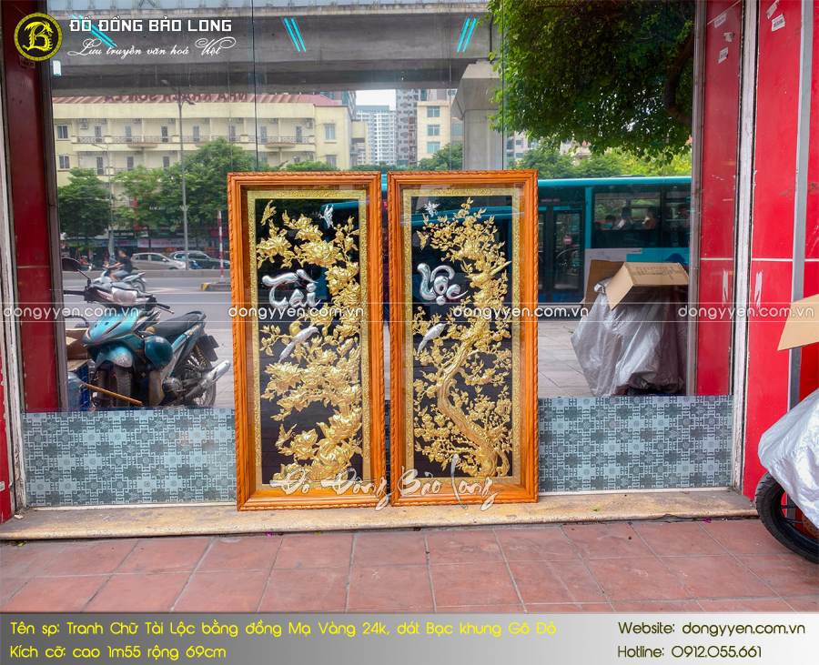 Đôi tranh chữ Tài Lộc mạ vàng dát bạc khung gỗ đỏ 1m55 có kiểu dáng độc đáo, là sản phẩm mới nhất của Bảo Long. Tục lệ treo tranh chữ trong nhà của người Việt đã có từ lâu, trong đó, các chữ như Phúc, Lộc, Thọ được sử dụng nhiều nhất. Bức tranh được chế tác bằng đồng, kiểu dáng độc đáo, bắt mắt. Đây chính là lựa chọn tuyệt vời để treo trong phòng khách hay phòng làm việc.
