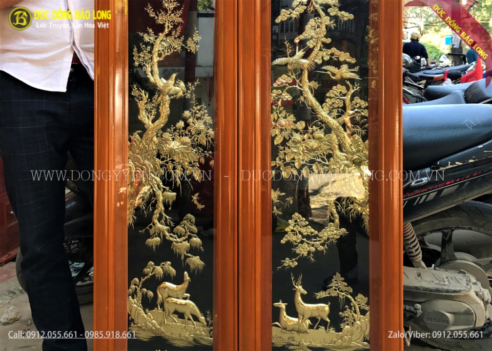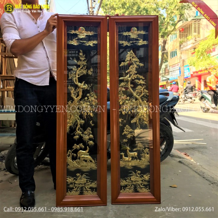 Đôi tranh tứ thời Tùng Lộc - Mai Điểu thuộc hàng cao cấp, độc đáo rất hiếm trên thị trường. Tranh được chạm tay hoàn toàn thủ công từ đồng vàng nhập khẩu Hàn Quốc, đồng dày 8rem, khung gỗ đinh hương cao cấp. Bộ tranh chỉ có hai bức nhưng lại có cả mai lan cúc trúc, đại diện cho bốn mùa xuân hạ thu đông, ghép cùng với Hươu, Nai, Điểu mang ý nghĩa sâu sắc. Bộ tranh có kích thước 1m39