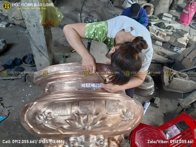 Công đoạn này cần người thợ có kinh nghiệm cao để khắc chữ lên thân đỉnh chuẩn nhất