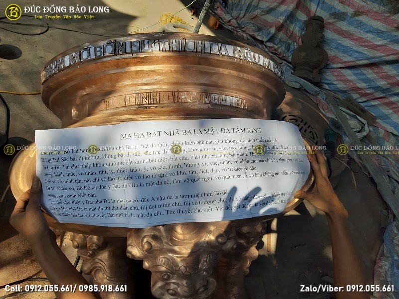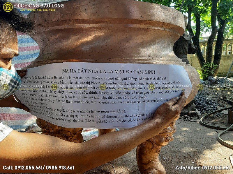 - Tiến hành dán bài kinh trên bầu lư và chạm chữ theo yêu cầu của nhà chùa