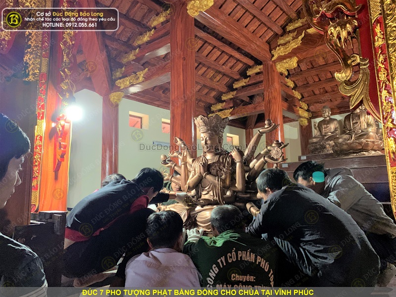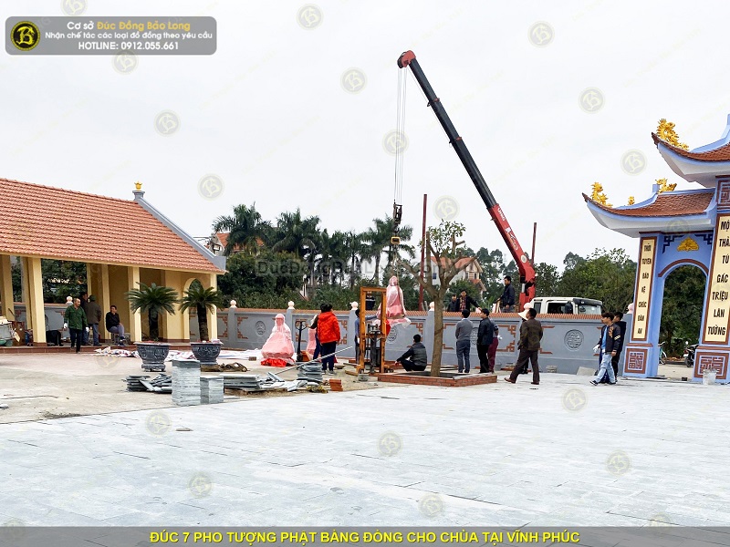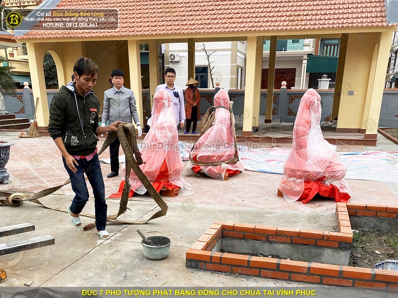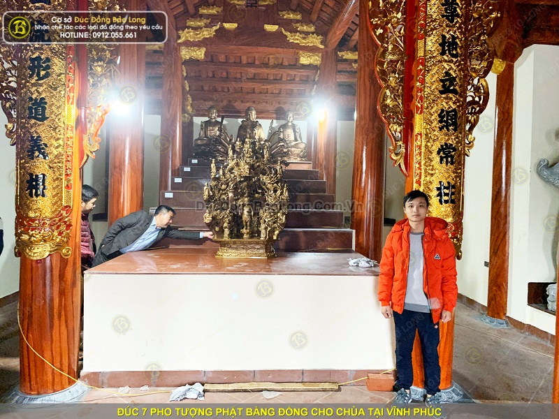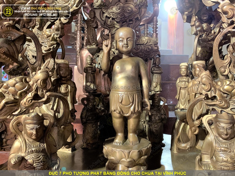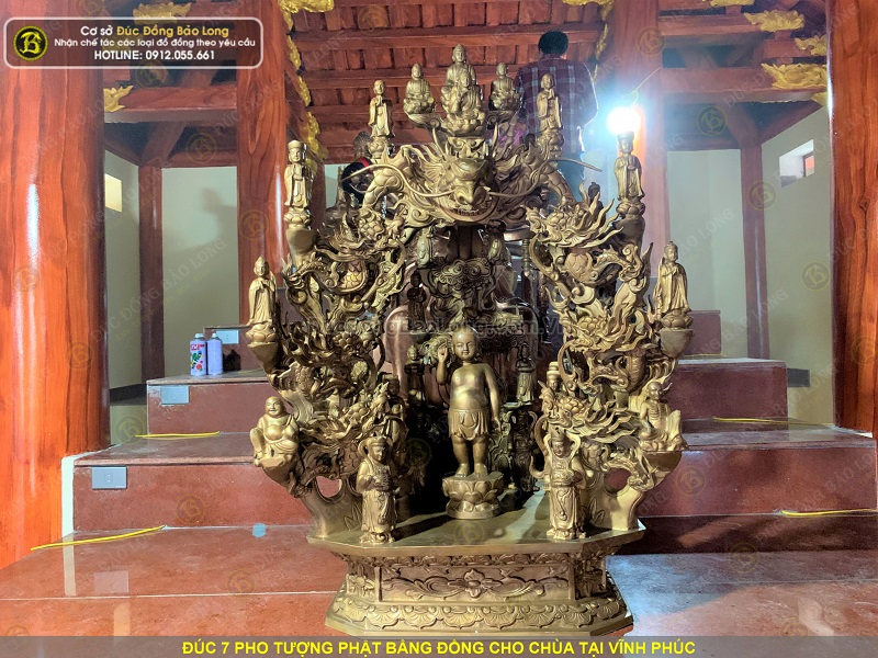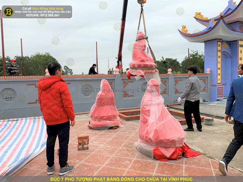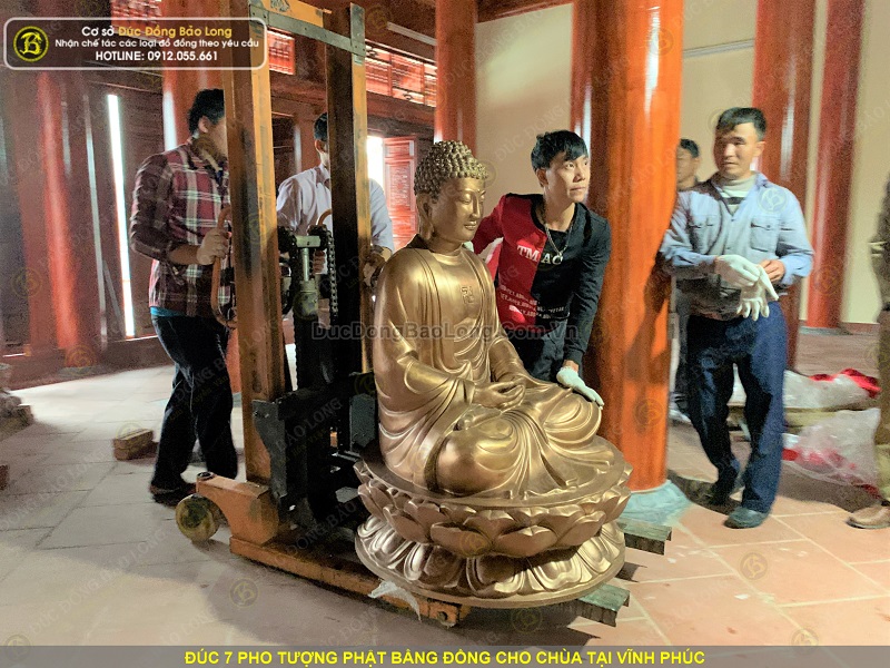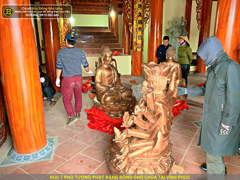 7 Pho tượng Phật bằng đồng đều được sản xuất tại xưởng đúc đồng Bảo Long. Toàn bộ 7 pho tượng được đúc hoàn toàn 100% thủ công theo phương pháp truyền thống. Nguyên liệu đúc là đồng đỏ thanh khiết. Sau khi chế tác xong, chúng tôi đã tiến hành vận chuyển và bàn giao thành công cho nhà chùa trước sự chứng kiến của đông đảo bà con những người tham gia tiến cúng vào chùa.