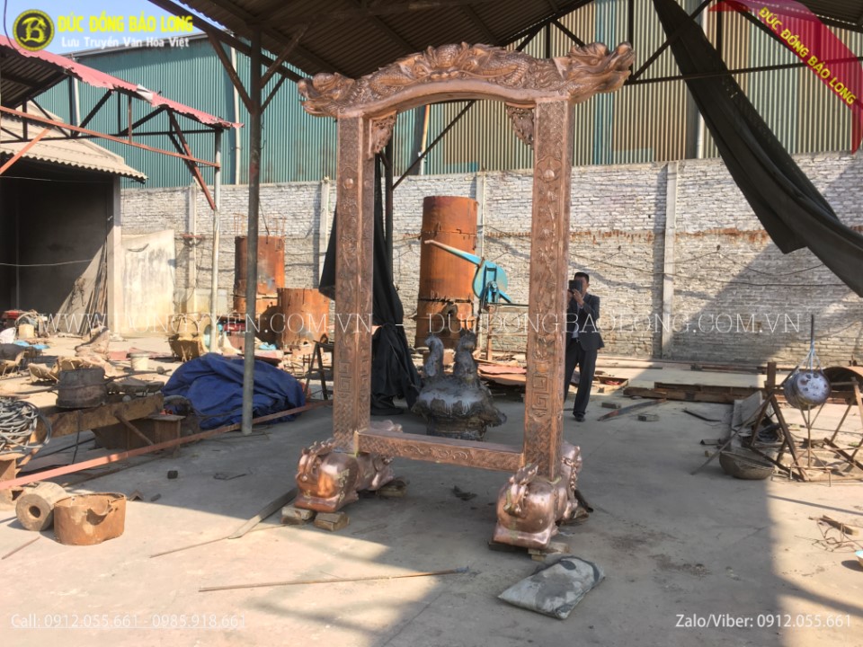 Giá treo chuông được đúc hoàn toàn thủ công từ nguyên liệu đồng đỏ thanh khiết. Mọi công đoạn đúc giống với quy trình đúc các loại đồ đồng khác. Giá chuông được tạo hoa văn rất đẹp mắt, đúc rồng nổi, thân giá 2 cột chạm tùng cúc trúc mai. Giá chuông rất chắn chắn, đảm bảo có thể treo quả chuông 1 tấn trong thời gian dài mà không sợ bị hư hỏng.