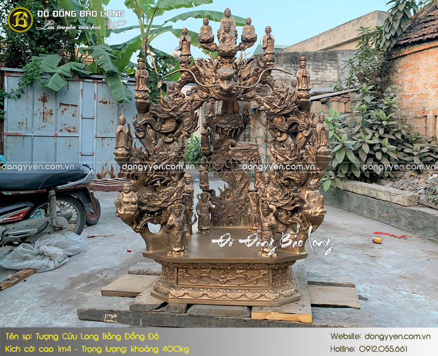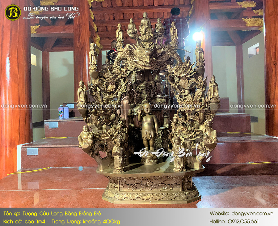 Tượng Cửu Long bằng đồng đỏ cao 1m4 cho chùa mới đây đã được Bảo Long hoàn thành. Sản phẩm dược chế tác từ đồng đỏ thanh kiết, hoàn toàn thủ công 100%. Tòa tượng Phật được xử lý màu sắc rất đẹp, các chi tiết được các nghệ nhân tỉ mỉ hoàn thành. Khi nhìn vào pho tượng, ta thấy có hồn hơn, sống động hơn nhiều. Pho tượng đồ sộ, nhiều chi tiết nhỏ, đòi hỏi người thợ có nhiều kinh nghiệm mới hoàn thành.