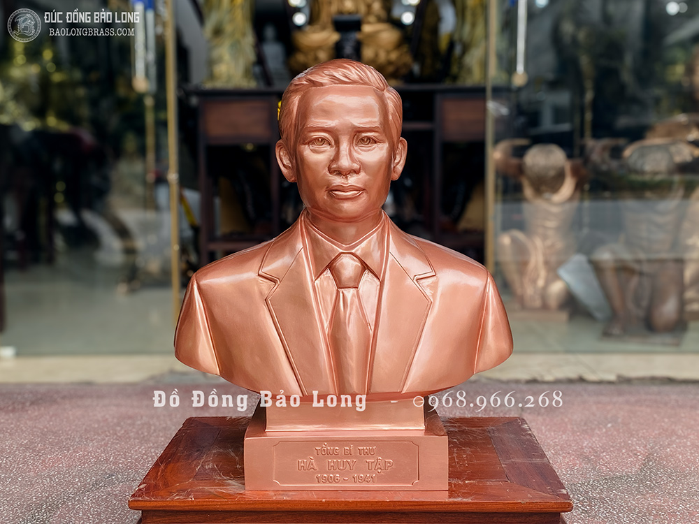 Đúc tượng chân dung Hà Huy Tập bằng đồng đỏ cao 61cm là tác phẩm nghệ thuật mang giá trị lịch sử và tinh thần sâu sắc, được chế tác hoàn toàn thủ công bởi các nghệ nhân lành nghề. Sản phẩm sử dụng chất liệu đồng đỏ thanh khiết – dòng vật liệu cao cấp trong ngành đúc đồng mỹ nghệ, nổi bật với độ bền vượt trội và màu sắc sang trọng theo thời gian.