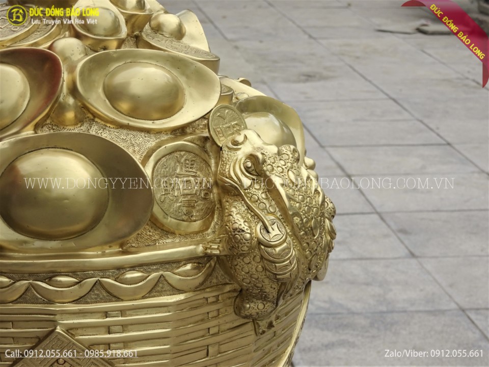 Đúc Đồng Bảo Long đúc hoàn thiện Giỏ Tiền Phong Thủy Bằng Đồng catut 48cm cho khách hàng ở Sài Gòn. Gió tiền phong thủy cao 48cm miệng giỏ có 4 con cóc ngậm tiền tha tiền về giỏ, đúc tinh xảo bằng đồng vỏ đạn catut nặng chừng 60kg đồng. Giỏ tiền phong thủy chứa đầy tiền vàng mang ý nghĩa tại lộc đầy ắp, mang lại may mắn cho gia chủ về tài chính, làm ăn kinh doanh. Với việc đúc Giỏ Phong Thủy bằng đồng đã làm tăng cát khí cho vật phẩm, kết hợp với việc bày giỏ đúng cách sẽ giúp cho gia chủ kinh doanh thuận lợi hơn, tài chính tăng trưởng nhiều hơn.