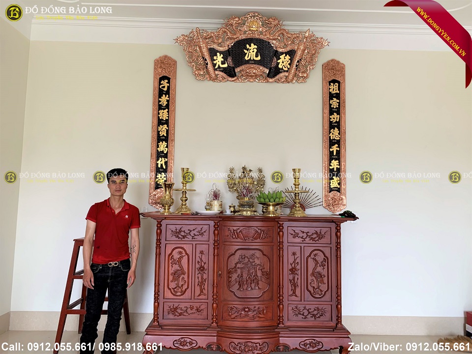Bộ hoành phi câu đối bằng đồng cho ban thờ 1m76