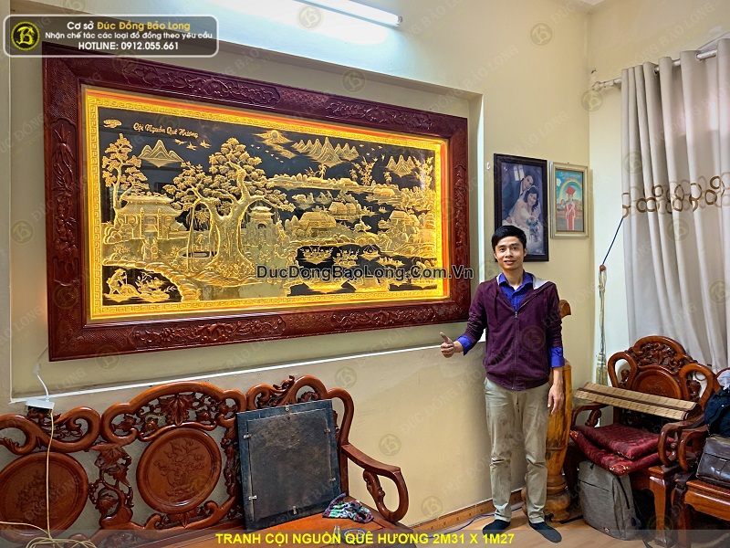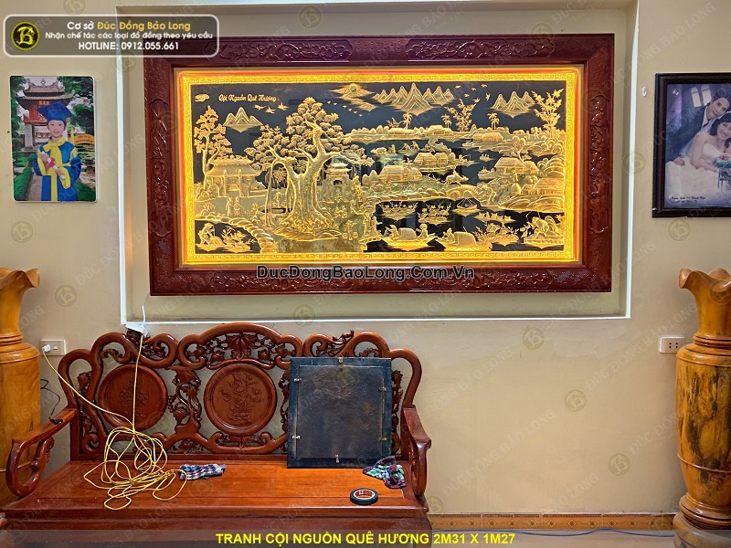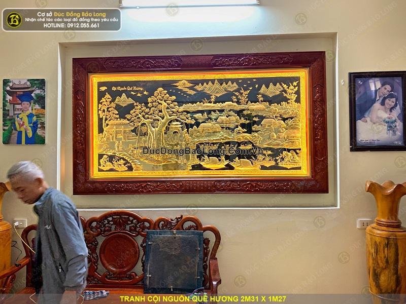 – Chất liệu bề mặt: giữ nguyên màu đồng vàng, tranh cội nguồn quê hương được tạo màu giả cổ