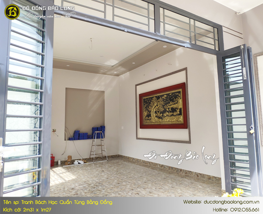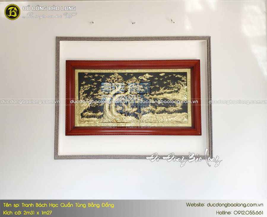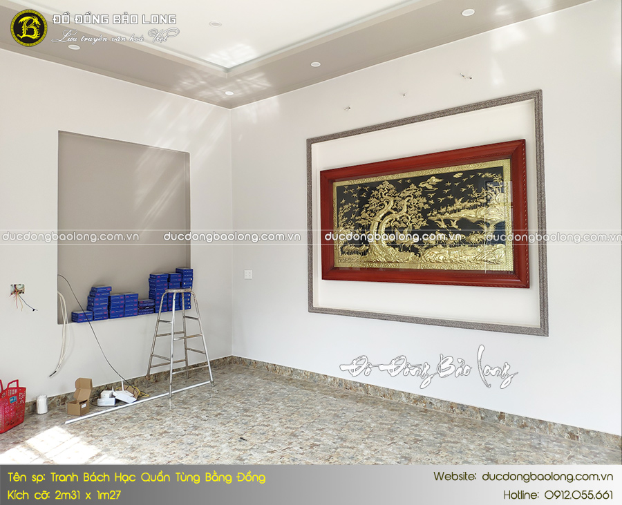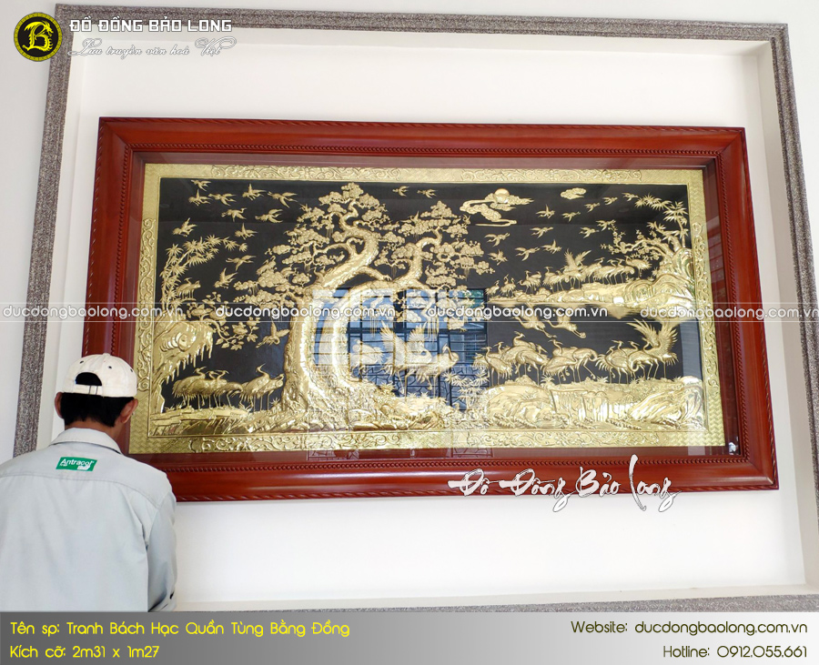 Tuần vừa rồi, cơ sở Đúc Đồng Bảo Long vừa hoàn thiện, bàn giao và lắp đặt mẫu tranh Bách Hạc Quần Tùng 2m31 x 1m27 cho gia đình anh Công tại TP. Hồ Chí Minh. Đây là bức tranh khổ lớn, thuộc dòng sản phẩm phân khúc tầm trung tại cơ sở chúng tôi. Sản phẩm được chế tác thủ công hoàn toàn bằng tay với bề mặt giữ nguyên màu đồng mộc kết hợp phần nền sơn màu đen độc đáo.