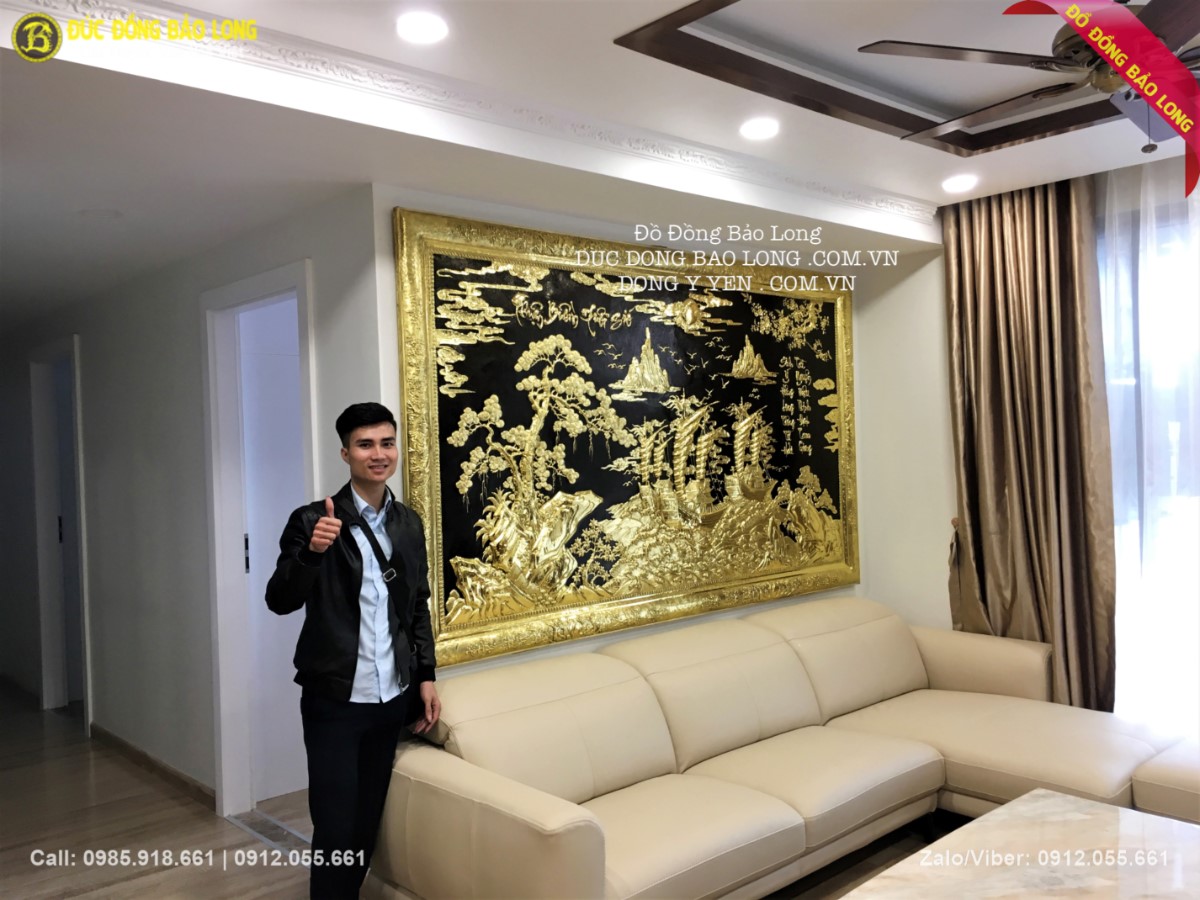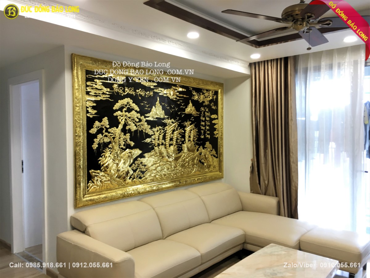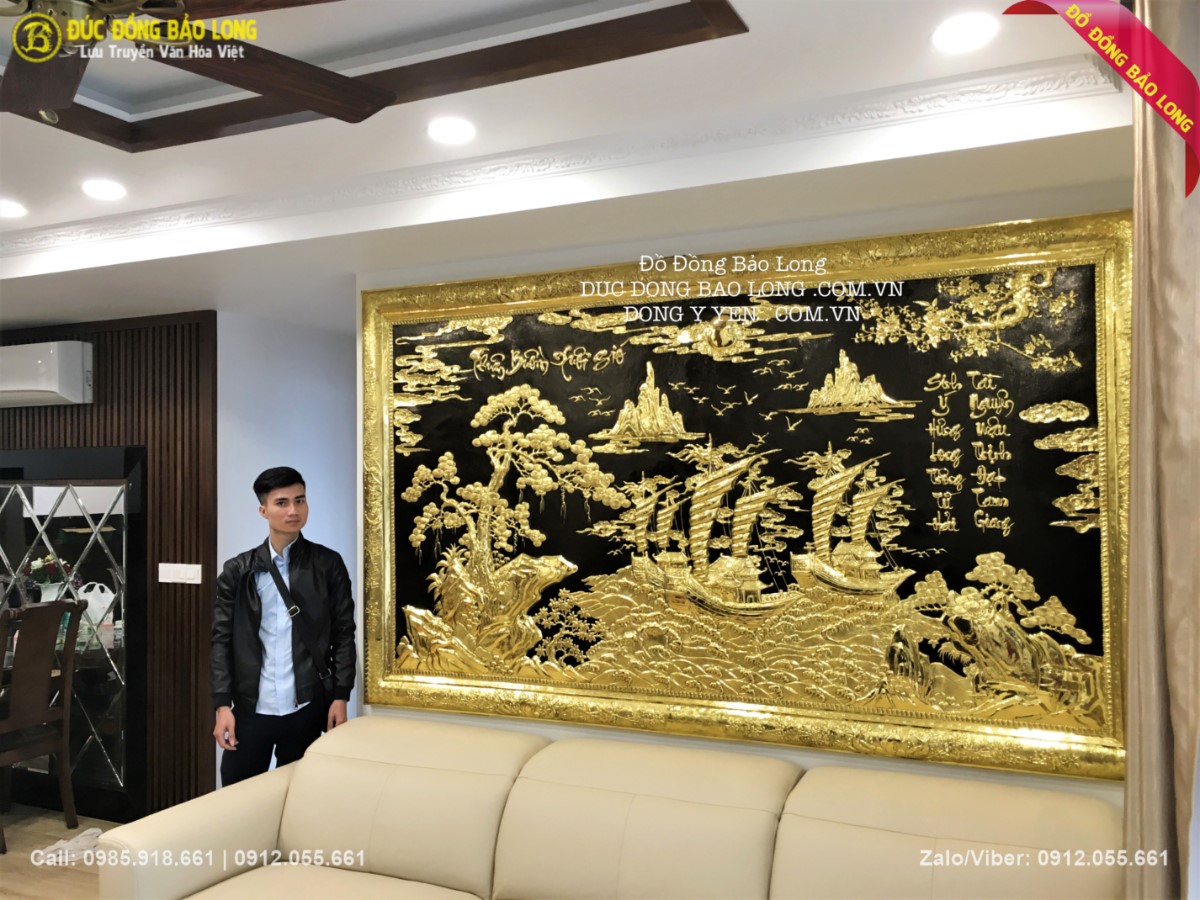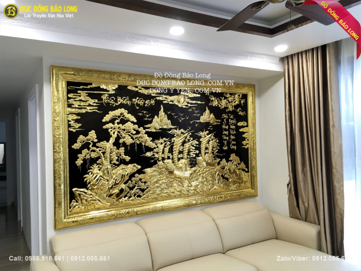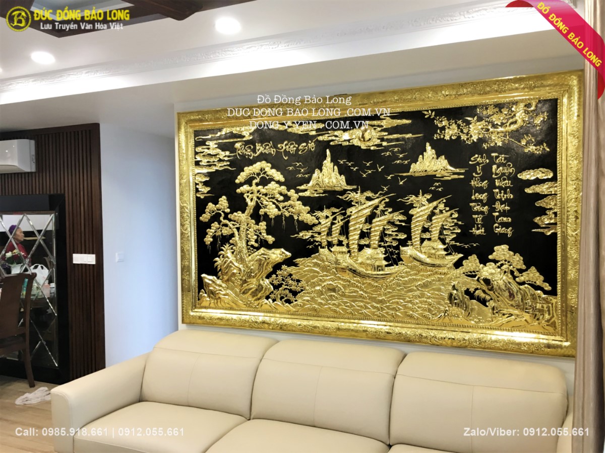 Bảo Long hoàn thiện và lắp đặt bức Thuận Buồm Xuôi Gió khung liền đồng hàng cao cấp dài 2m62 cao 1m55 cho khách ở Hà Nội lắp tại căn Pen house của CC Cao Cấp Imperial Plaza Giải Phóng - Hà Nội. Tranh được chạm hoàn toàn thủ công từ nguyên liệu đồng vàng nhập khẩu Hàn Quốc với độ dày 8rem, đủ độ dày để tranh không bị méo, lồi lõm, bề mặt luôn được đảm bảo. Tranh còn được thiết kế khung xương phía sau khá chắc chắn, đảm bảo độ ổn định trên tường.