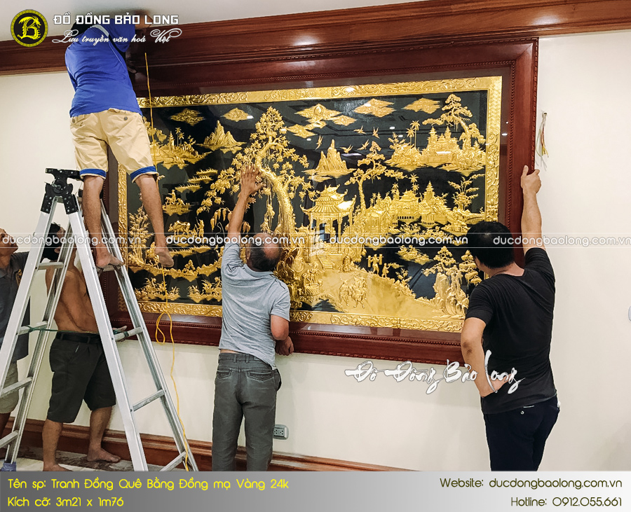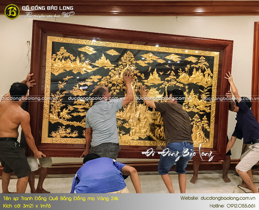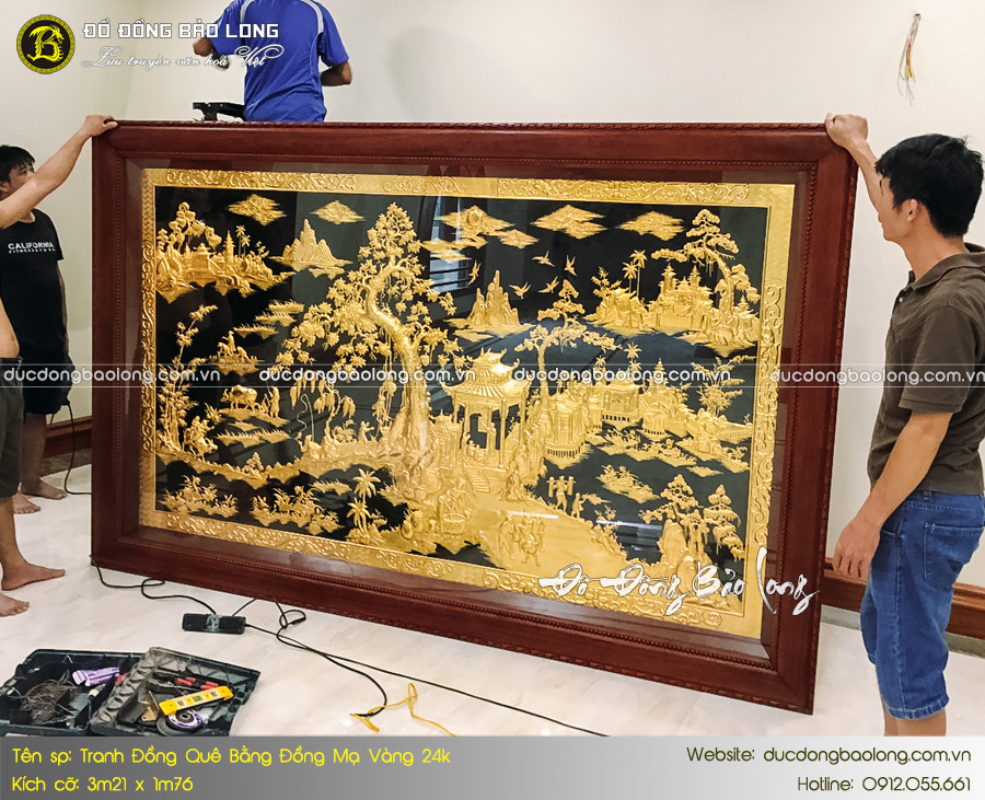 Mới đây, Đúc Đồng Bảo Long đã hoàn thiện và bàn giao bức tranh Đồng Quê bằng đồng 3m21 x 1m76 cho vị khách hàng tại Quảng Ninh. Toàn bộ bề mặt hoa văn được phủ vàng ròng 24k kết hợp sơn nền đen vô cùng độc đáo. Sản phẩm được chế tác trên tấm đồng dày dặn, độ dày tiêu chuẩn 8rem nhập khẩu Hàn Quốc.