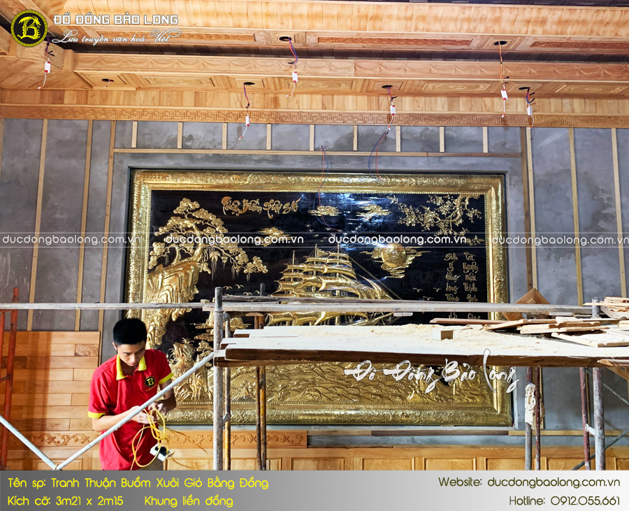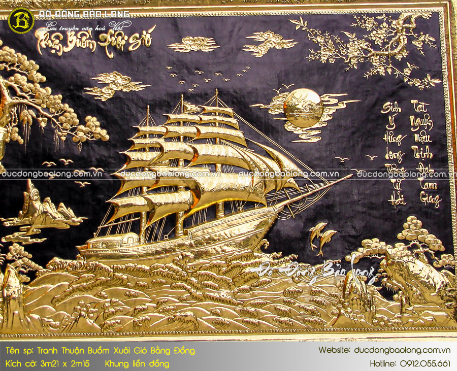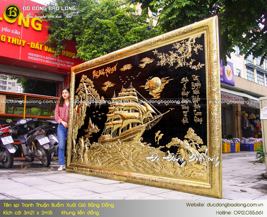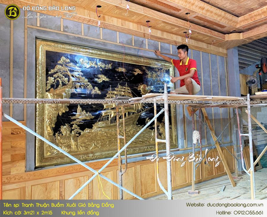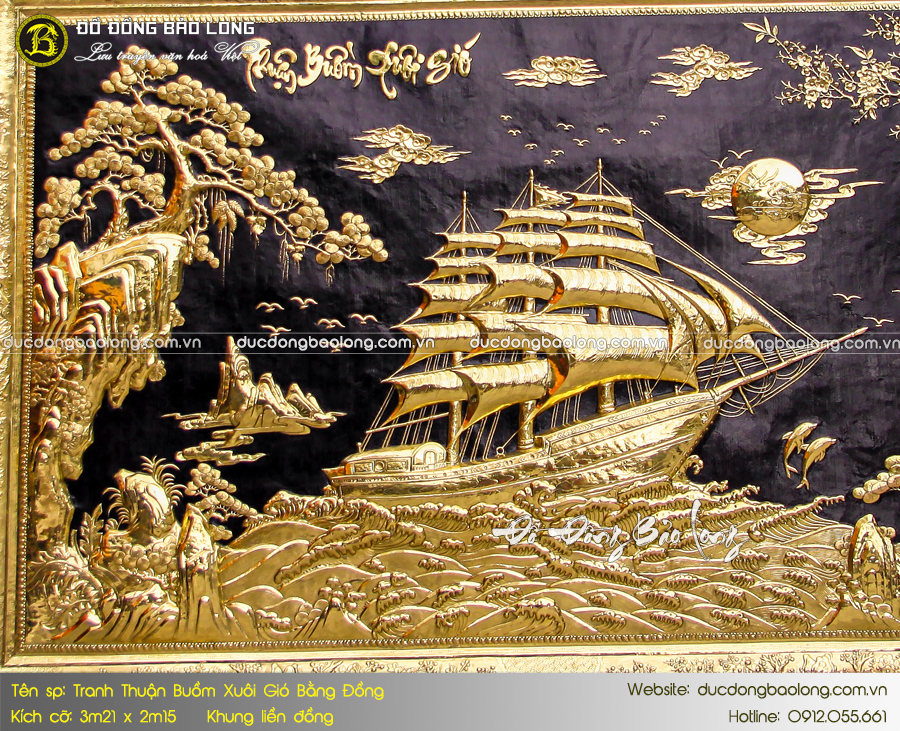Nổi bật bởi vẻ đẹp sang trọng, đẳng cấp, tinh xảo trong từng nét gò chạm, tranh Thuận Buồm Xuôi Gió khung liền đồng 3m21 x 2m15 được khách hàng và giới chuyên môn đánh giá cao về tính thẩm mỹ và chất lượng. Sản phẩm được chế tác thủ công bởi nghệ nhân làng nghề đúc đồng truyền thống Ý Yên, Nam Định.