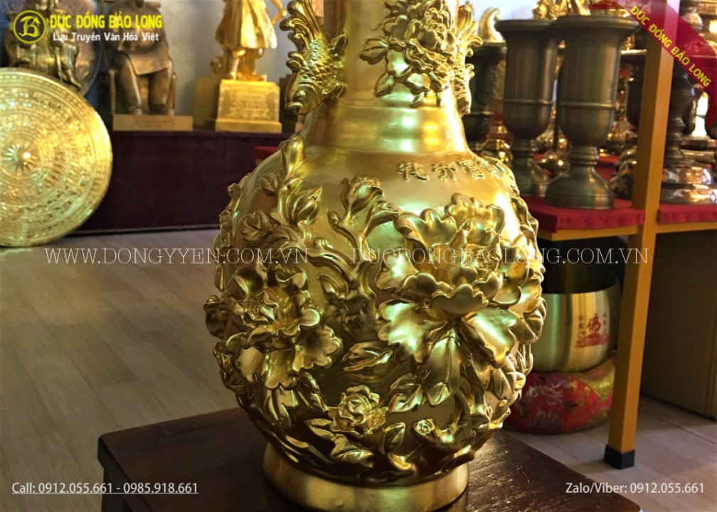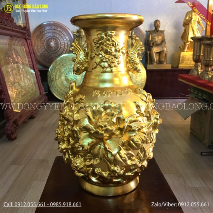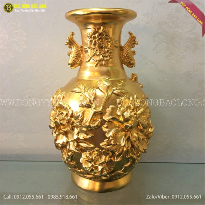 Lọ hoa mẫu đơn cá chép được đúc hoàn toàn thủ công từ nguyên liệu đồng vàng, đúc rất dày dặn, sắc nét. Bầu lọ hoa rộng 20cm kín hình hoa mẫu đơn (hoa mẫu đơn là loại hoa đại diện cho sự giàu sang phú quý). Tai lọ hoa là 2 con cá chép trên cổ có 4 chữ nho "Hoa Khai Phú Qúy". Sản phẩm được dát vàng 9999 cho màu cực đẹp, sang trọng và đẳng cấp. Lọ hoa là những vật phẩm trang trí vừa thu hút tài lộc phú quý cho gia chủ dùng rất tốt cho phong thủy.