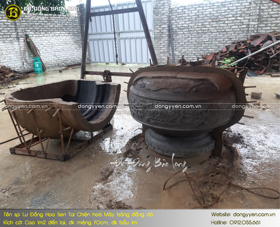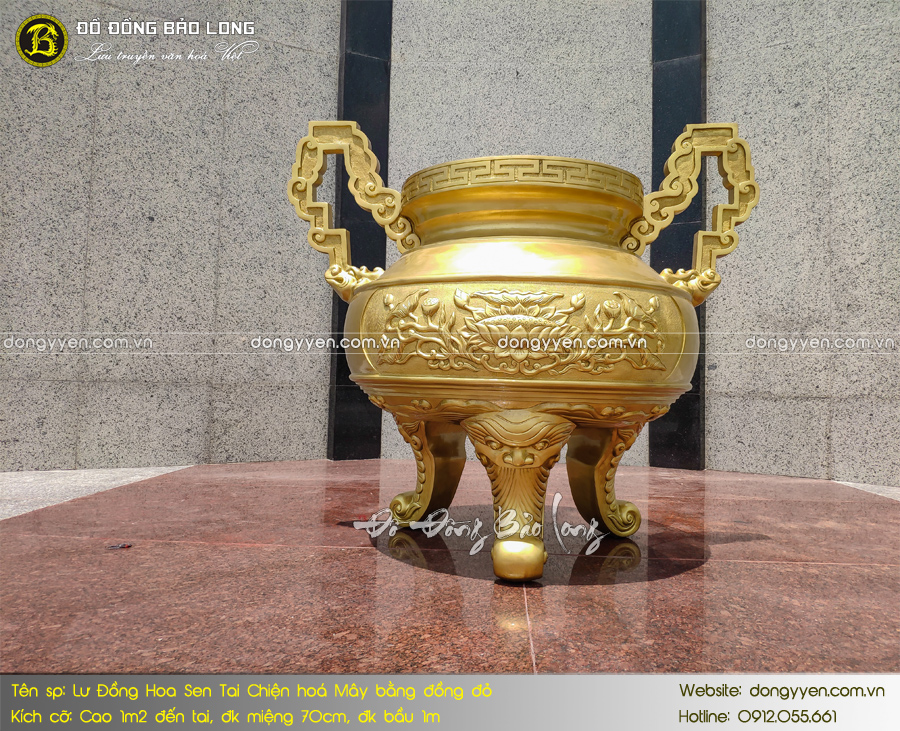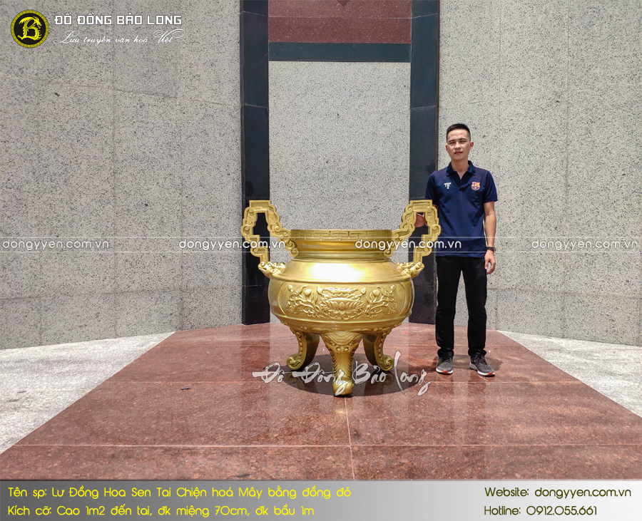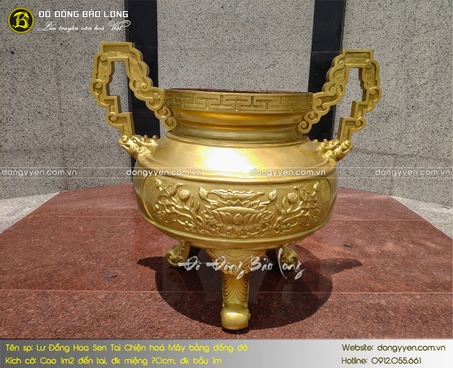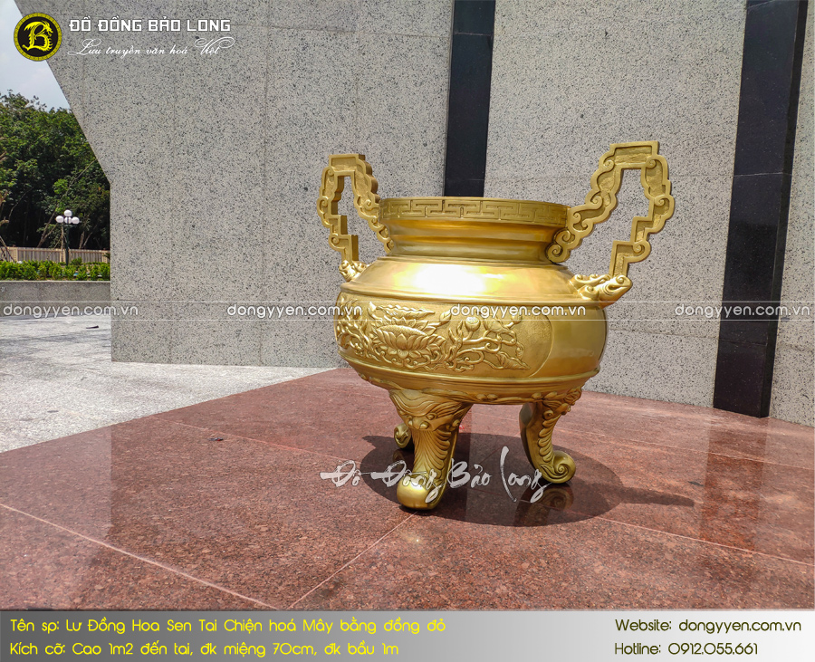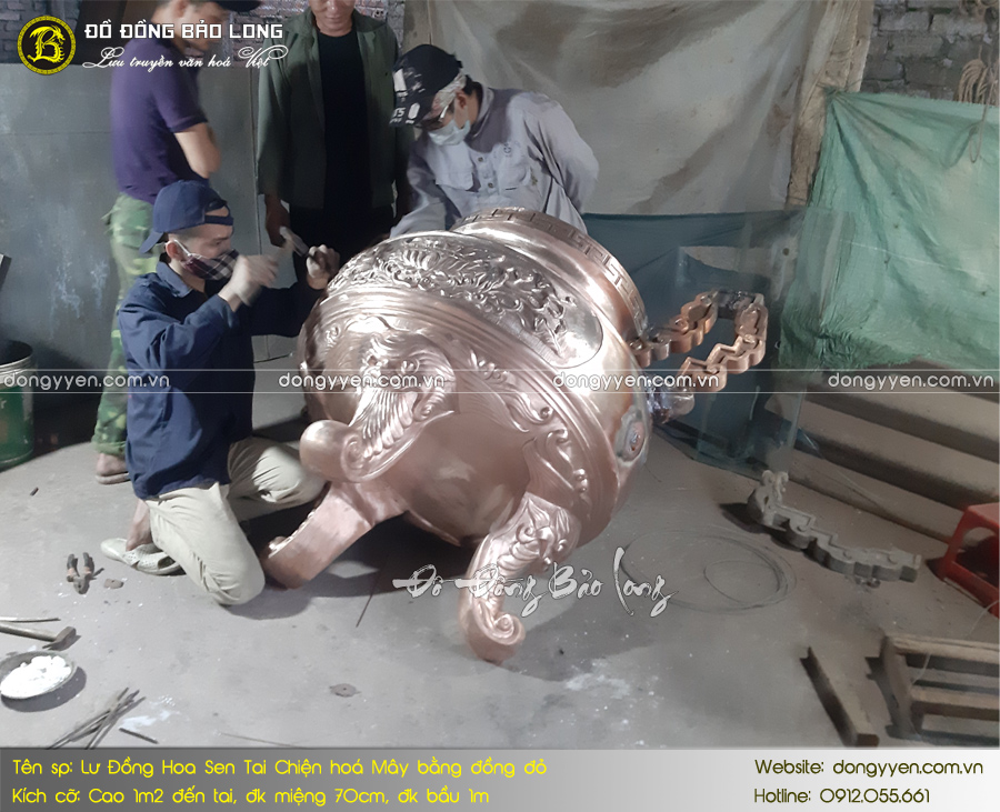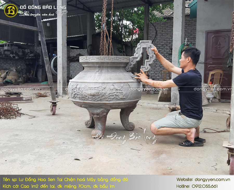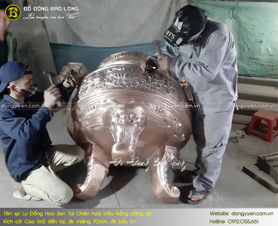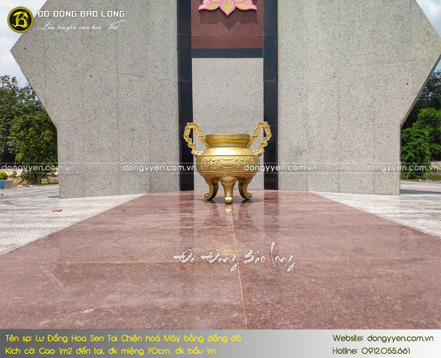 Lư hương đồng tai triện hóa Mây bằng đồng đỏ mới đây đã được Bảo Long chế tác và chuyển tới đài tưởng niệm. Mẫu sản phẩm có hoa văn hình bông sen, làm bằng chất liệu đồng đỏ. Bề ngoài, các nghệ nhân đã quét lớp sơn nhũ ánh vàng lên bề mặt lư hương. Mẫu sản phẩm có kiểu dáng độc đáo, ý nghĩa, tuổi thọ cao.