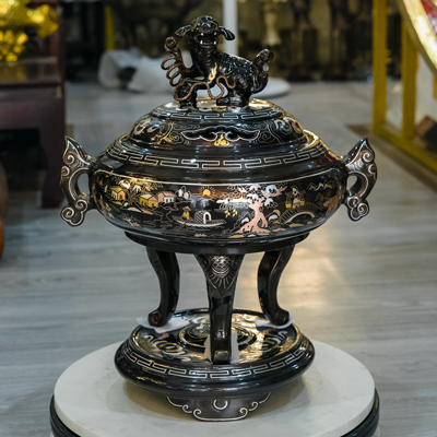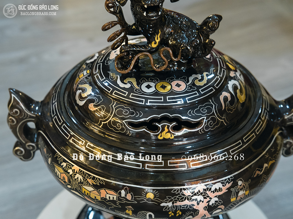 Điểm nổi bật của sản phẩm nằm ở phần thân lư được trang trí cảnh làng quê, thiên nhiên, mang đậm nét văn hóa truyền thống Việt Nam. Nắp lư được tạo hình linh vật, tượng trưng cho sự bảo hộ và linh thiêng. Đây không chỉ là vật phẩm dùng để xông trầm mà còn là tác phẩm mỹ nghệ mang tính sưu tầm cao.