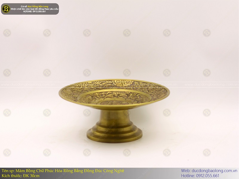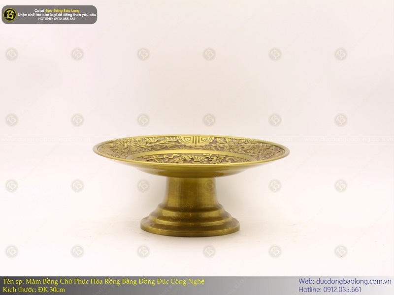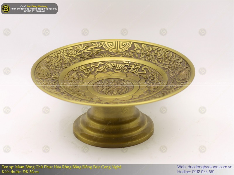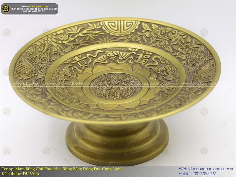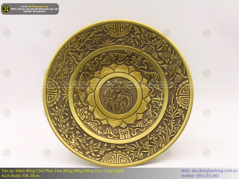 Mâm bồng chữ Phúc hóa rồng bằng đồng thau 30cm đúc công nghệ màu vàng đậm