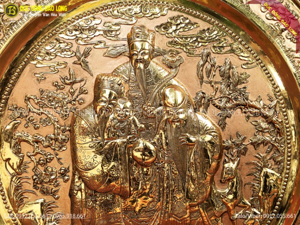 Mâm đồng Phúc Lộc Thọ được gò hoàn toàn thủ công từ đồng vàng nguyên tấm nhập khẩu từ đồng vàng dày 1ly, thúc nổi 3 ông Tam Đa (Phúc Lộc Thọ) dưới chân là tiền vàng, xung quanh là cảnh huơu nai, hoa cỏ, chim muông,...Vành mâm được chạm 4 chữ Phúc kể cả ông Phúc trong lòng mâm thành Ngũ Phúc. Vành mâm còn được chạm các chữ Thọ đan xem với hoa dây, tùng cúc trúc mai đầy đủ.