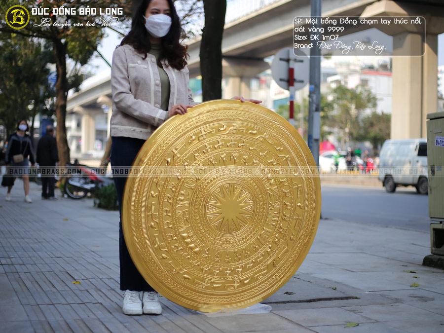 Nằm trong danh sách những mẫu mặt trống đẹp nhất tại cơ sở Bảo Long, mẫu mặt trống đồng Đông Sơn dát vàng 9999 đk 1m07 là lựa chọn hoàn hảo cho mọi không gian bài trí. Sản phẩm được chế tác thủ công bởi nghệ nhân hàng đầu với chất lượng hoàn thiện cực tốt. Nếu bạn đang quan tâm đến mặt trống đồng trưng bày, hãy cùng khám phá xem sản phẩm này có điểm gì đặc sắc nhé!.