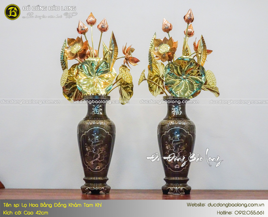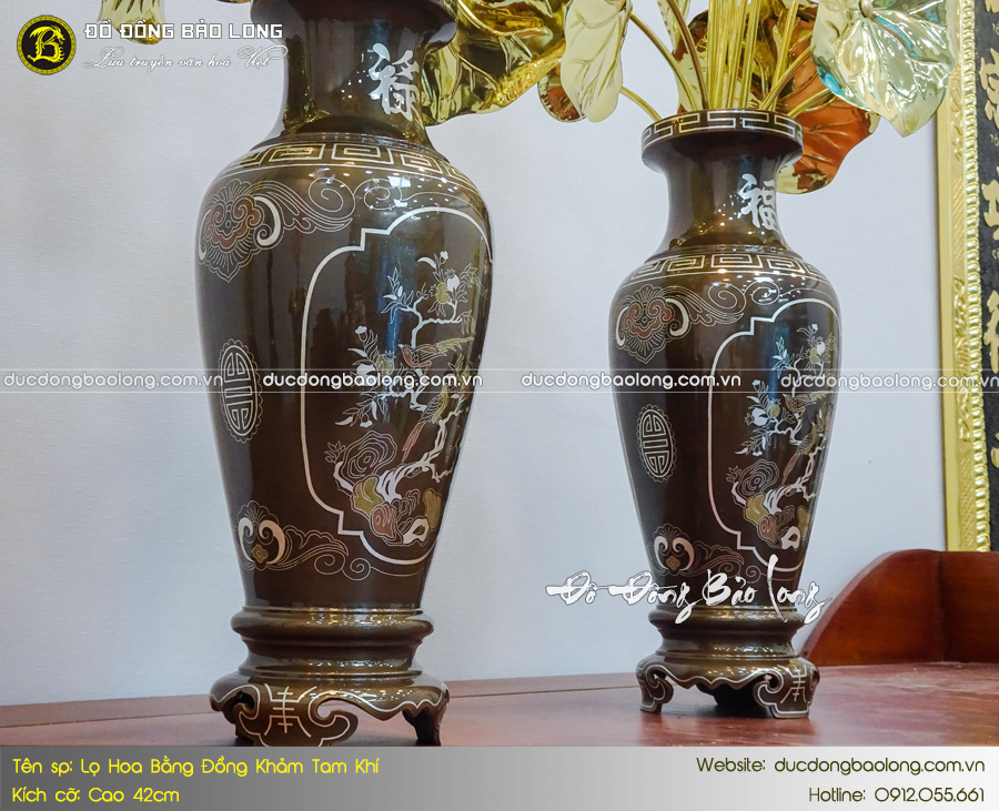 Mẫu lọ hoa bằng đồng khảm tam khí là dòng sản phẩm cao cấp tại cơ sở Đúc Đồng Bảo Long với bề mặt được khảm thêm các kim loại quý như bạc lá, đồng đỏ, đồng xanh độc đáo. Sản phẩm có chất lượng hoàn thiện tốt, hoa văn tinh xảo sắc, sắc nét, vô cùng đẳng cấp.