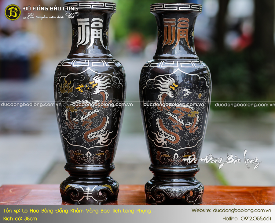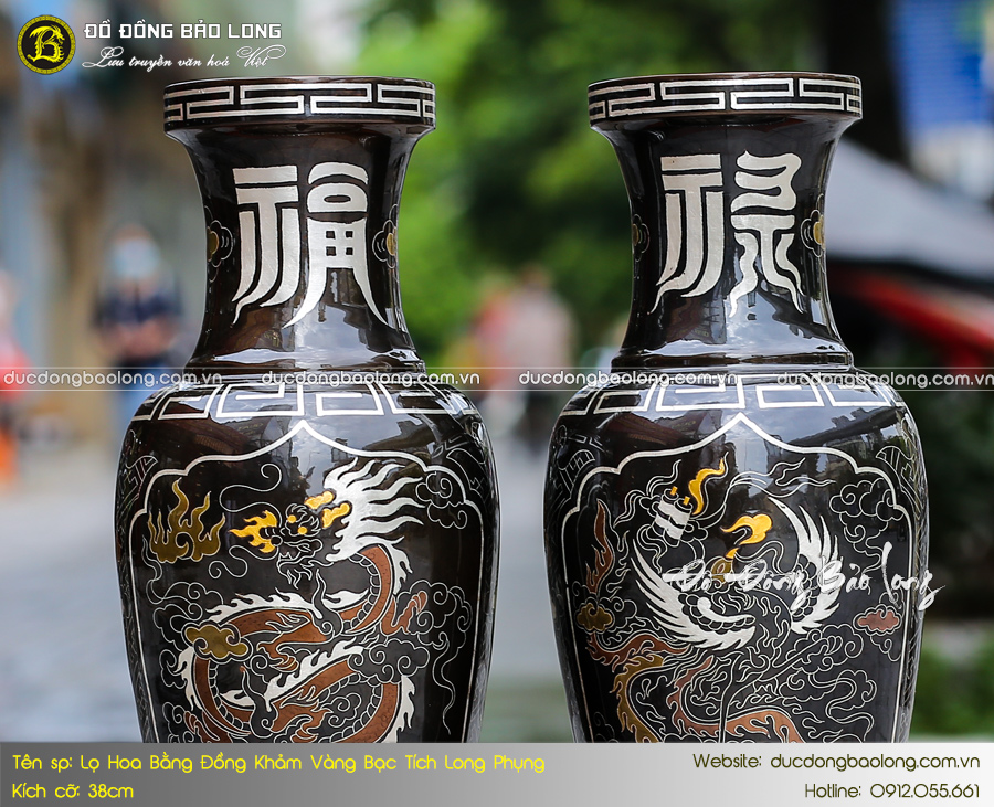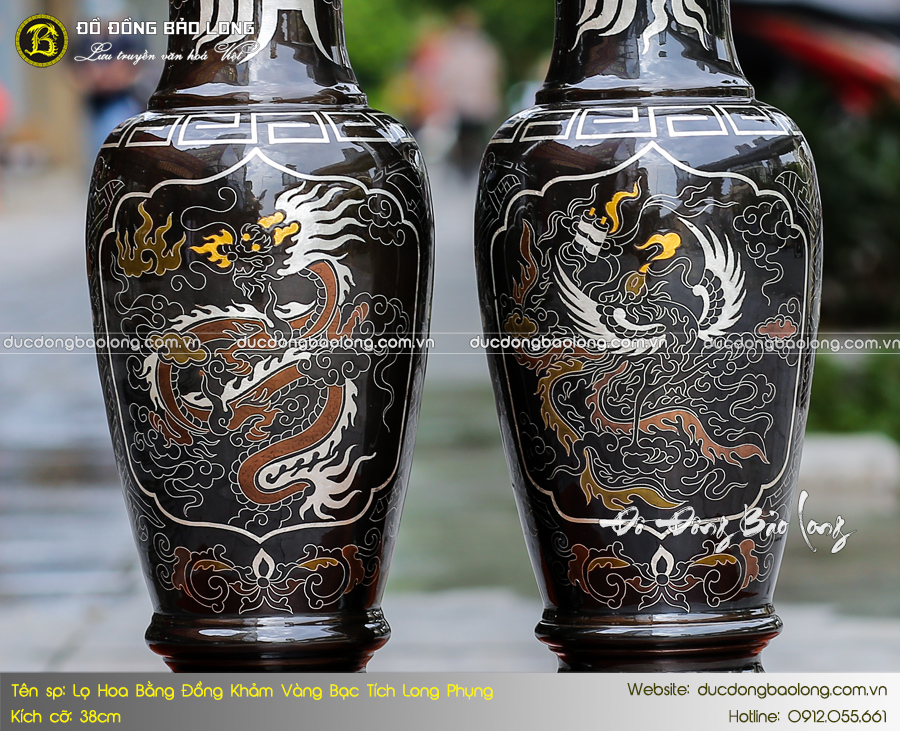 Lấy cảm hứng từ chiếc bảo bình cổ trong Phật giáo, mẫu lọ hoa bằng đồng khảm vàng bạc hoa văn Long Phụng được thiết kế theo hình khí phong thủy, giúp thu hút tài lộc, may mắn. Đây là một trong những dòng sản phẩm cao cấp tại Đúc Đồng Bảo Long được chế tác thủ công tinh xảo bởi nghệ nhân làng nghề. Sản phẩm có hình khối cân đối, hoa văn sắc nét với các chi tiết điểm vàng, bạc sang trọng, tạo điểm nhấn hoàn hảo cho không gian thờ.