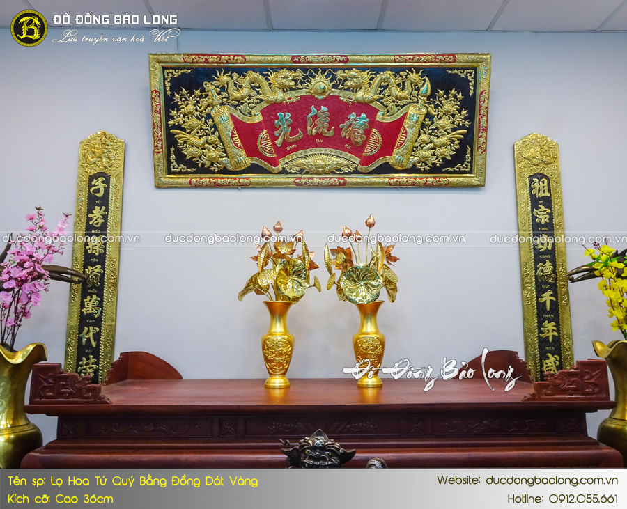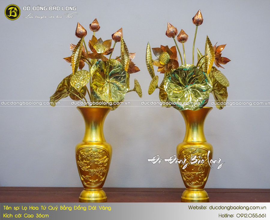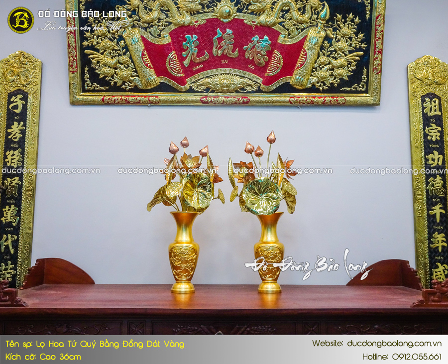 Với kích thước 36cm, mẫu lọ hoa Tứ Quý bằng đồng dát vàng phù hợp với nhiều không gian thờ khác nhau. Ngoài ra, quý khách có thể sử dụng thêm các sản phẩm kích thước 40cm, 42cm, 50cm, 61cm...