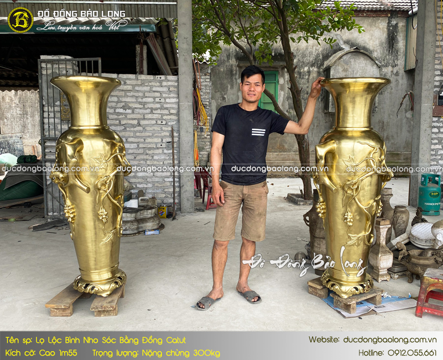 Mẫu lộc bình Nho Sóc mang kiểu dáng độc đáo, thiết kế hoa văn tinh xảo, được chế tác hoàn toàn thủ công. Nguyên liệu đúc sử dụng đồng catut cao cấp cho màu sắc ánh xanh sang trọng, mới lạ, và độ bền trường tồn cùng thời gian. Sản phẩm được nghiên cứu, sáng tạo và chế tác bởi nghệ nhân cơ sở Đúc Đồng Bảo Long.
