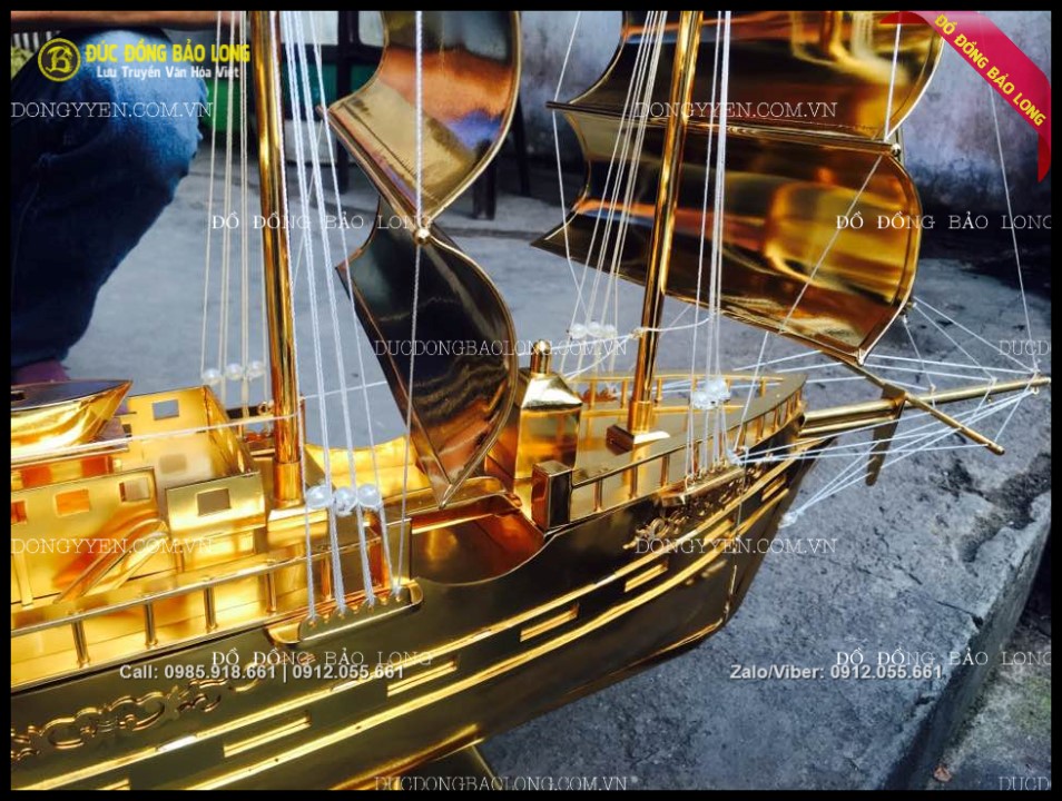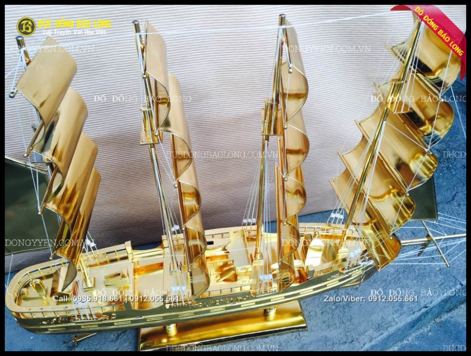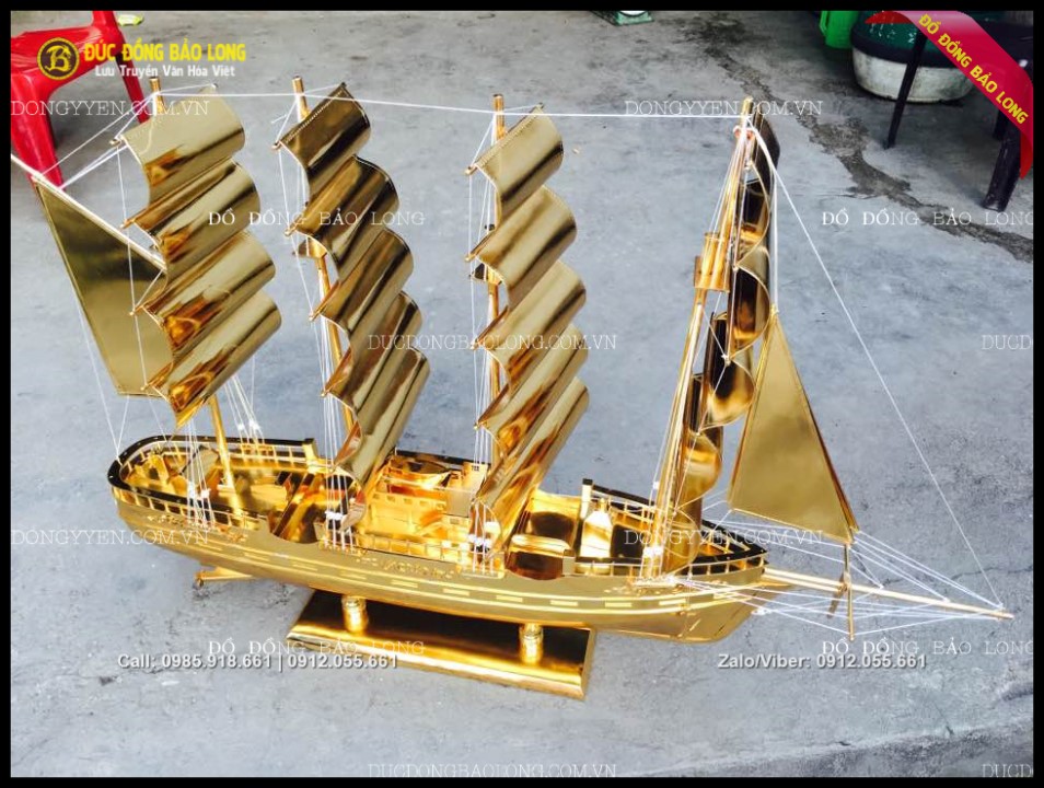 Mô hình thuyền buồm được gò thủ công từ nguyên liệu đồng vàng nguyên tấm nhập khẩu Hàn Quốc. Sản phẩm này có rất nhiều những chi tiết nhỏ do vậy cần đo đạc và bố trí rất cẩn thận. Thuyền buồn còn được mạ phủ vàng ròng 24k bằng phương pháp điện phân nhúng bể cao cấp nhất hiện nay, giúp cho sản phẩm được sang trọng, đẳng cấp hơn, vàng còn giúp sản phẩm không bị oxi hóa bởi không khí và màu sắc luôn luôn như mới.