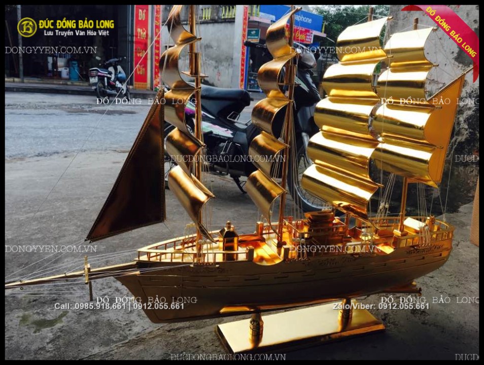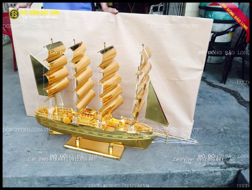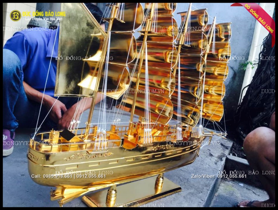 Cơ sở Tranh Đồng Bảo Long vừa hoàn thiện gò, chạm sản phẩm mô hình thuyền buồm bằng đồng mạ vàng 24k. Thuyền buồm được xem là một biểu tượng của sự thành công trong kinh doanh. Trước đây, thương nhân thường chọn hình ảnh thuyền buồm làm logo bởi vì nó tượng trưng cho gió, mang lại nhiều cuộc giao dịch trong kinh doanh được thuận lợi, tốt đẹp và thu được nhiều lợi nhuận. Do vậy, mô hình thuyền buồm được giới doanh nhân rất yêu thích và thường xuyên săn lùng các sản phẩm này để trưng bày tại phòng làm việc cuat mình hoặc có thể là những món quà rất có ý nghĩa cho anh em, bạn bè.