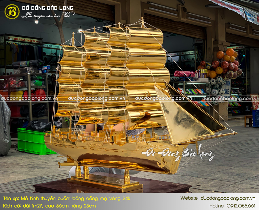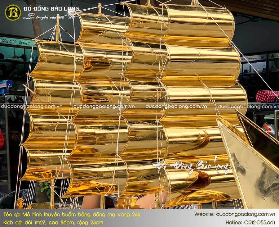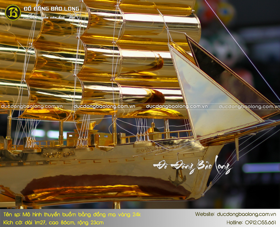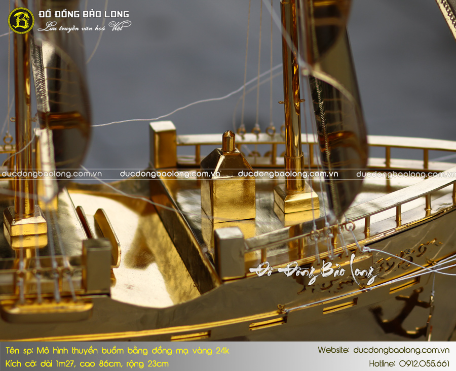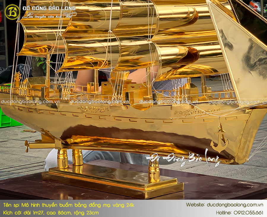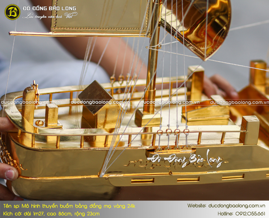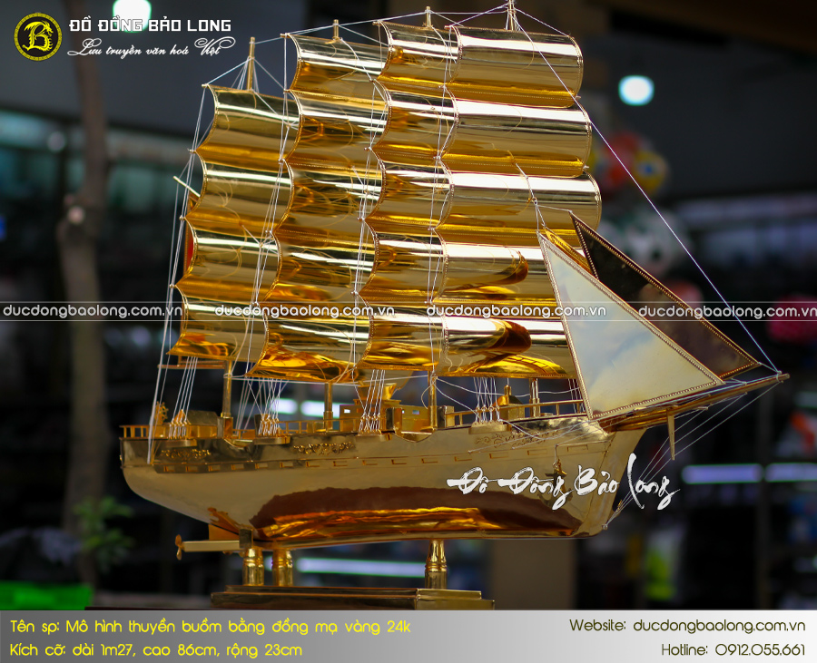 Mô hình thuyền buồm mạ vàng 24k kích thước 1m27 là dòng sản phẩm quà tặng phong thủy cao cấp tại cơ sở Đúc Đồng Bảo Long, được chế tác thủ công bởi nghệ nhân làng nghề đúc đồng truyền thống Ý Yên, Nam Định. Sản phẩm được khách hàng và giới chuyên môn đánh giá cao bởi mẫu mã đẹp, kết cấu chắc chắn, đường gò chạm vô cùng tinh xảo.