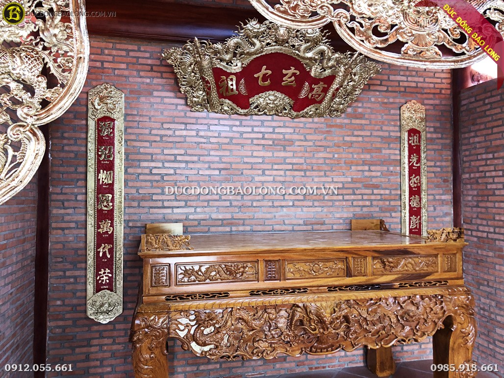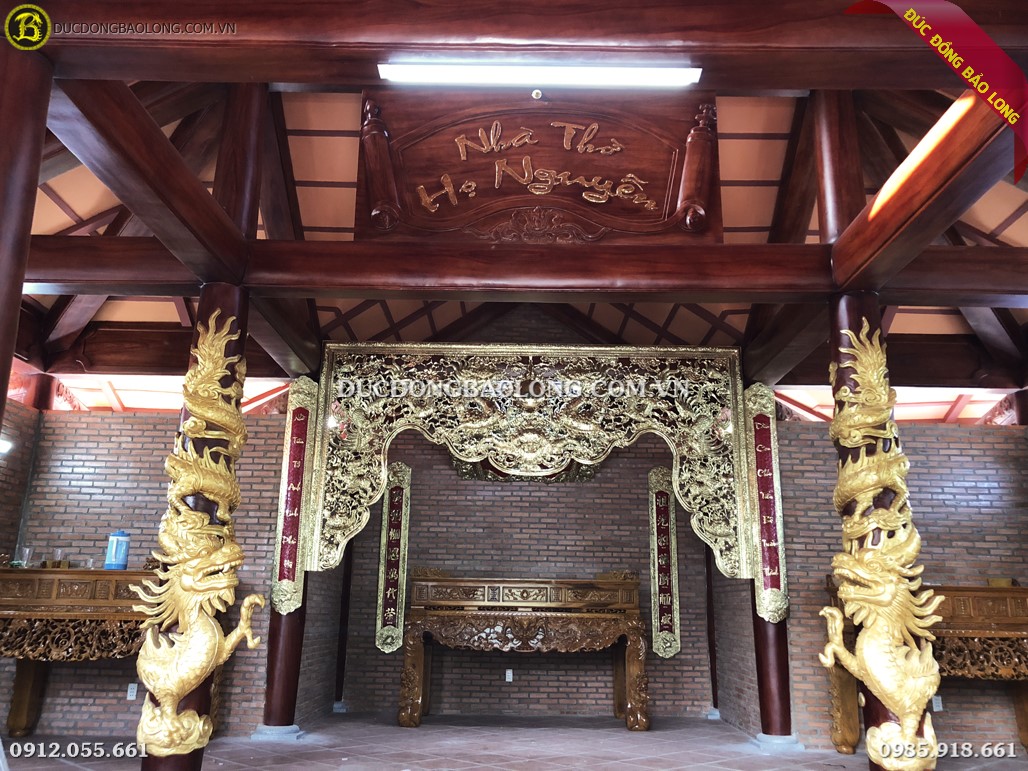 Cơ sở Đúc Đồng Bảo Long đã thi công lắp đặt hoàn thiện bộ cửa võng bằng đồng dài 3m7 cao 1m97 độ trùng 1m17, cùng đôi câu đối ốp cột 1m97 rộng 28cm, và bộ cuốn thư câu đối 1m76 cho 1 nhà thờ Họ Nguyễn tại Củ Chi - TPHCM. Toàn bộ sản phẩm được Bảo Long gia công chế tác hoàn toàn thủ công bằng đồng tấm nhập khẩu Hàn Quốc dày dặn chất lượng cao. Cửa võng, cuốn thư và câu đối đều được gia cố bằng xương Inox 304 giúp định hình và tăng cường độ bền vững cũng như chống chịu mọi thời tiết khắc nghiệt nhất. Với đặc thù sản xuất hoàn toàn thủ công từ đôi bàn tay nghệ nhân, với tiêu chí chế tác vô cùng khắt khe của doanh nghiệp chúng tôi cam kết đem lại cho quý khách hàng những sản phẩm không chỉ đẹp xuất sắc mà còn độc đáo không đụng hàng, trên hết vẫn là bền chắc trường tồn với thời gian.