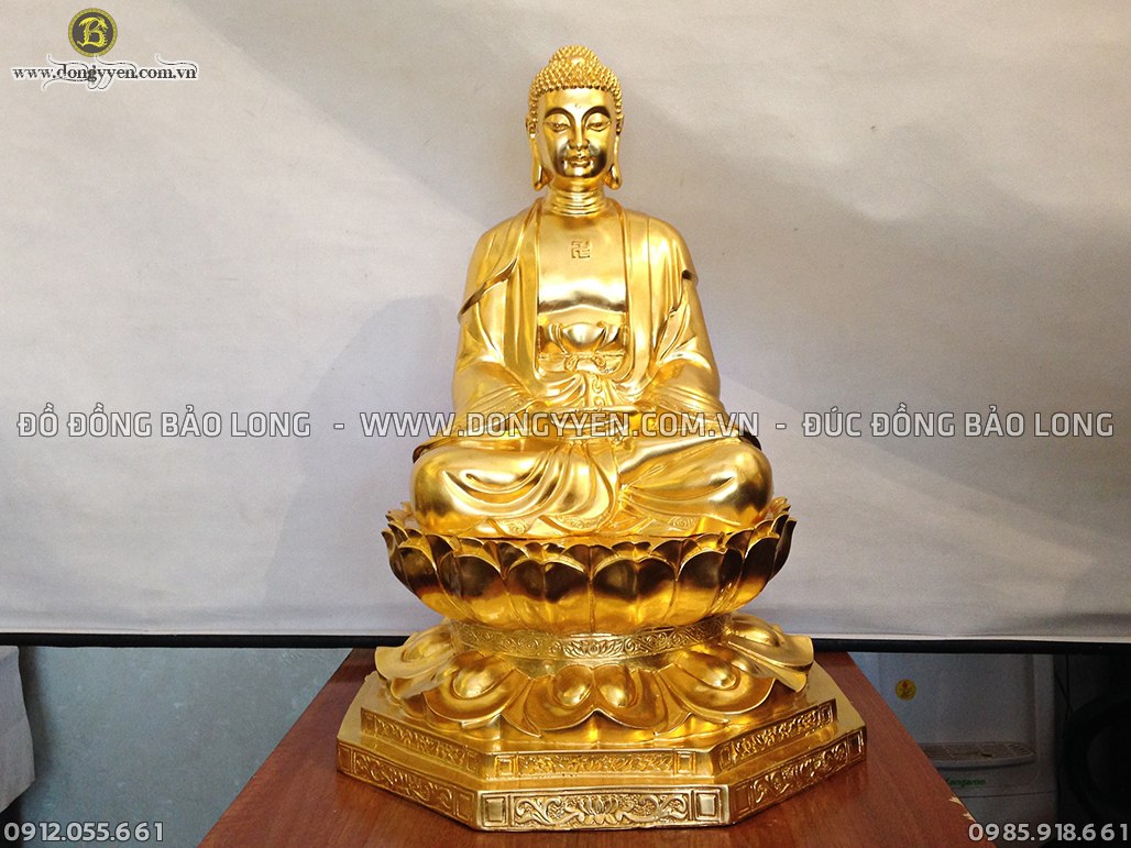 Tượng Phật Thích Ca Mâu Ni ngồi trên đài sen đúc liền khối, được đúc bằng đồng vàng cao cấp