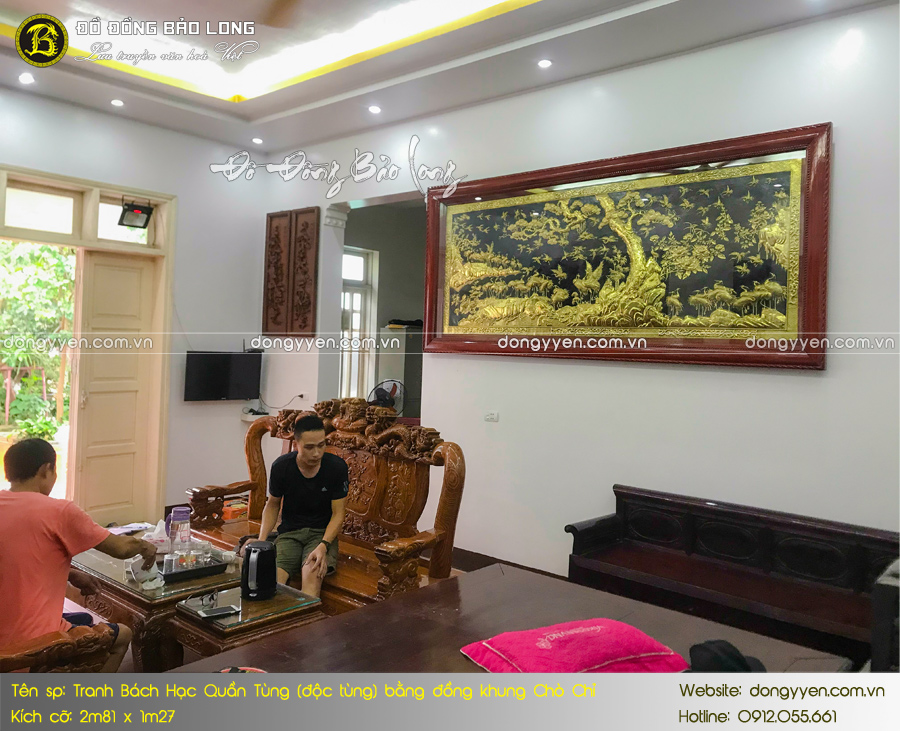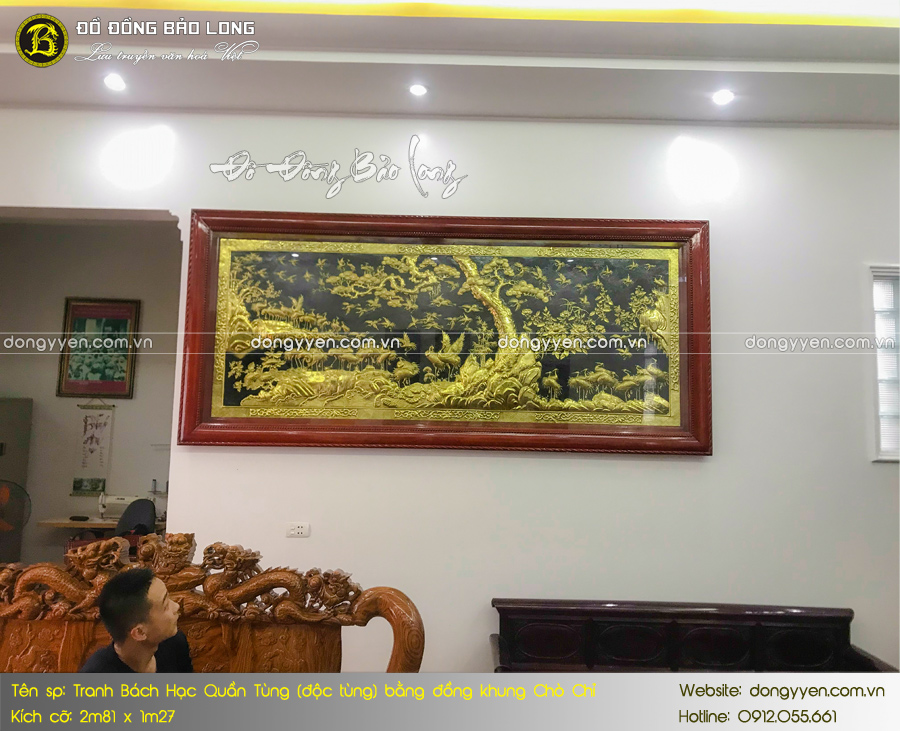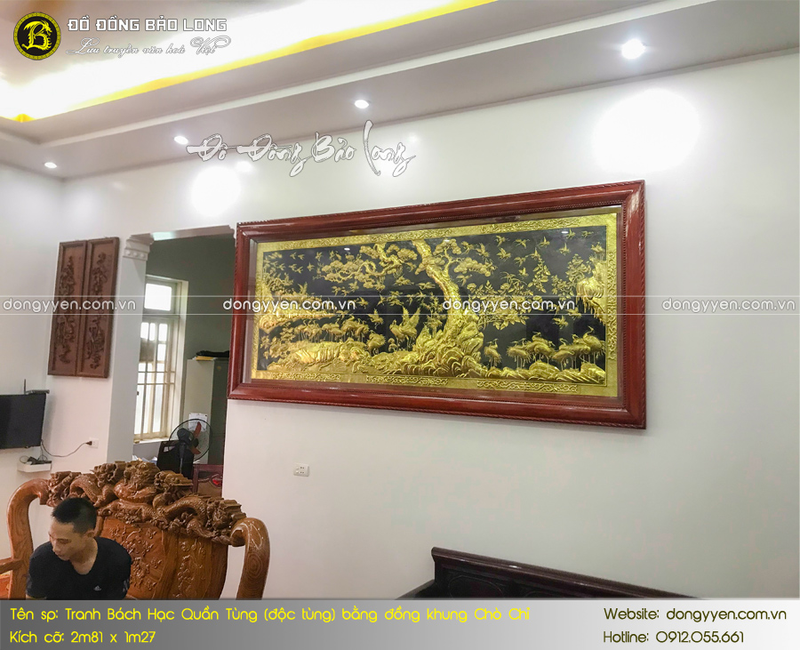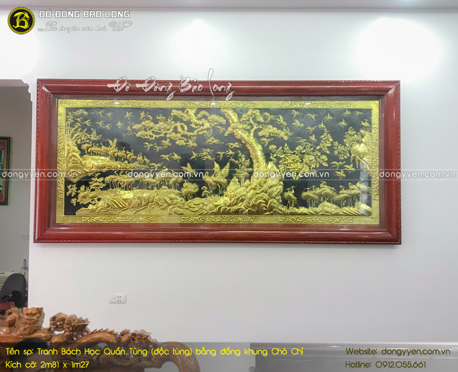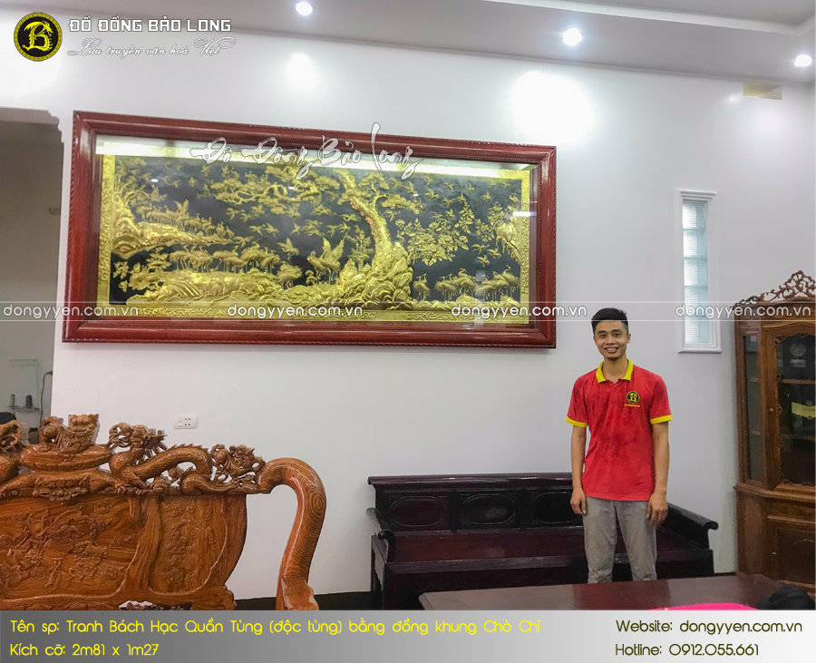 Tranh Bách Hạc Quần Tùng bằng đồng 2m81 x 1m27 là sản phảm mới nhất của chúng tôi chế tác cho khách hàng. Bức tranh được chế tác thủ công bởi các nghệ nhân lâu năm, màu sắc vàng nền đen. Tranh đồng sử dụng khung gỗ Chò Chỉ. Cùng với vẻ đẹp và ý nghĩa may mắn, đây là lựa chọn được rất nhiều người yêu thích treo trong nhà hay phòng làm việc.