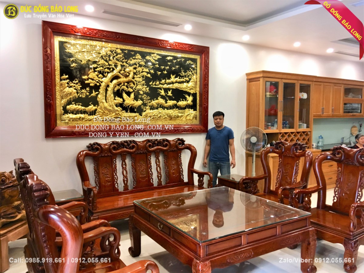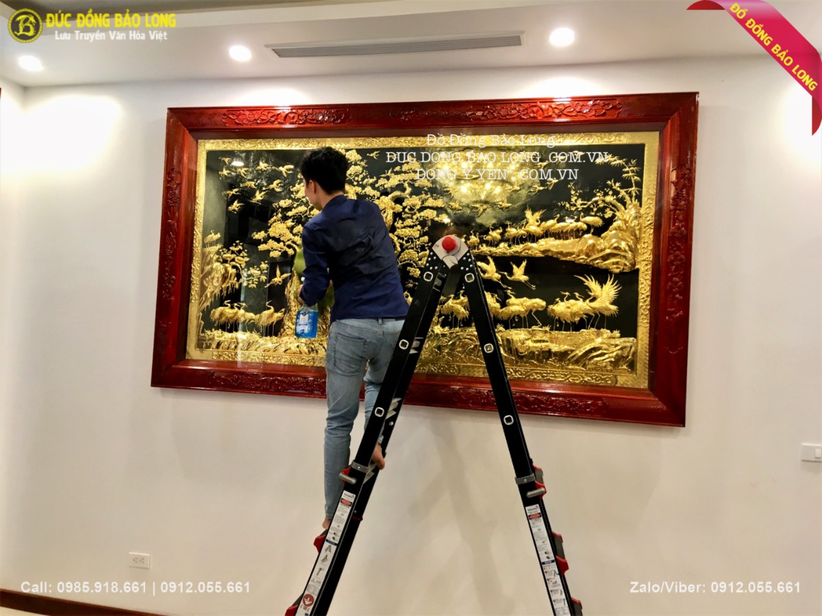 Đây là bức Tranh bách hạc - 100 con hạc được hoàn thiện theo đơn đặt hàng của anh khách ở Yên Hòa - Cầu Giấy - Hà Nội. Tranh Bách Hạc Quần Tùng có chiều dài 2m62 chiều cao 1m55 lòng tranh toàn bộ bằng đồng tấm dày 8rem nhập Hàn Quốc, chạm tay thủ công cho đường nét tinh xảo, sau đó được mạ phủ vàng ròng 24k 3 lớp điện phân nhúng bể cho màu sắc và độ bền hoàn hảo. Khung tranh Bách Hạc được làm từ gỗ Hương đục tứ quý vô cùng tỉ mẩn đẹp mắt. Tranh được treo tại phòng khách của nhà Biệt Thự cho vị khách kỹ tính biết chơi ở Yên Hòa, Cầu Giấy.