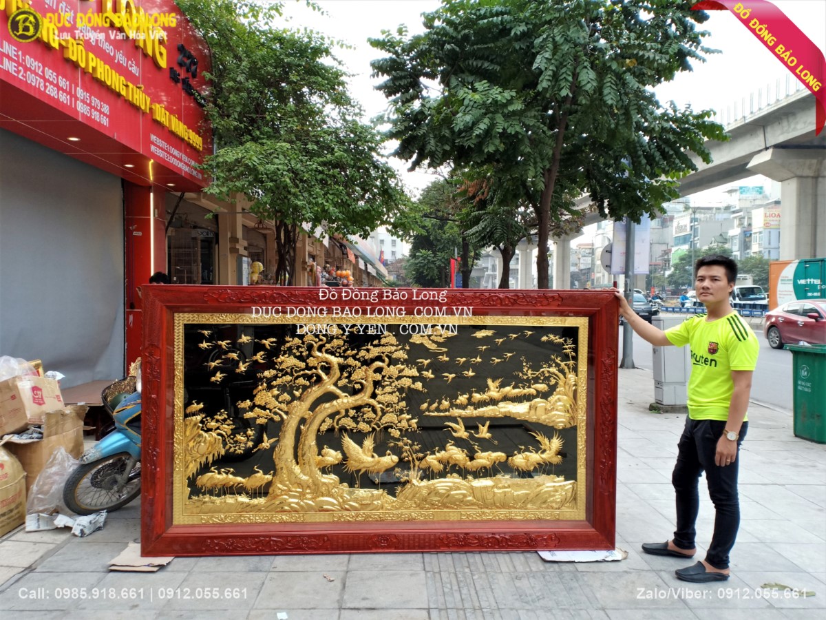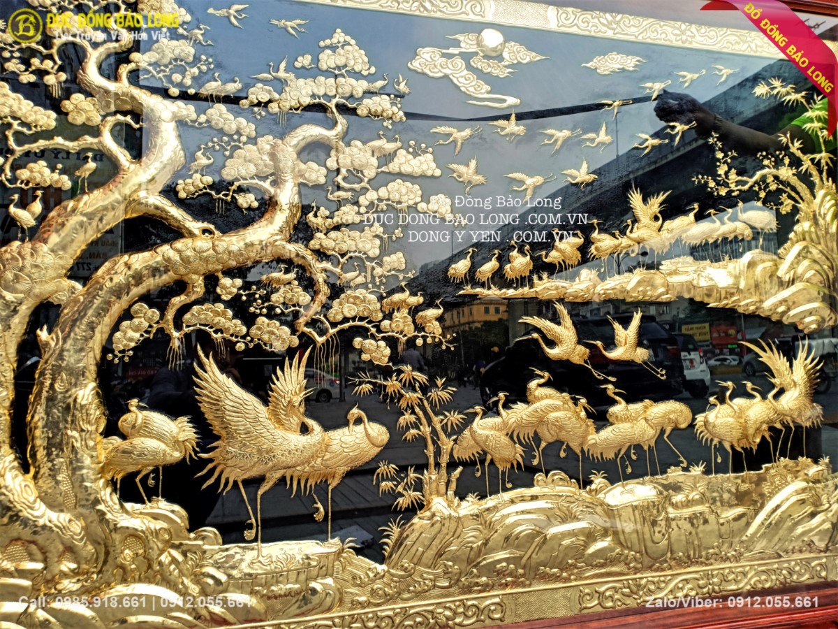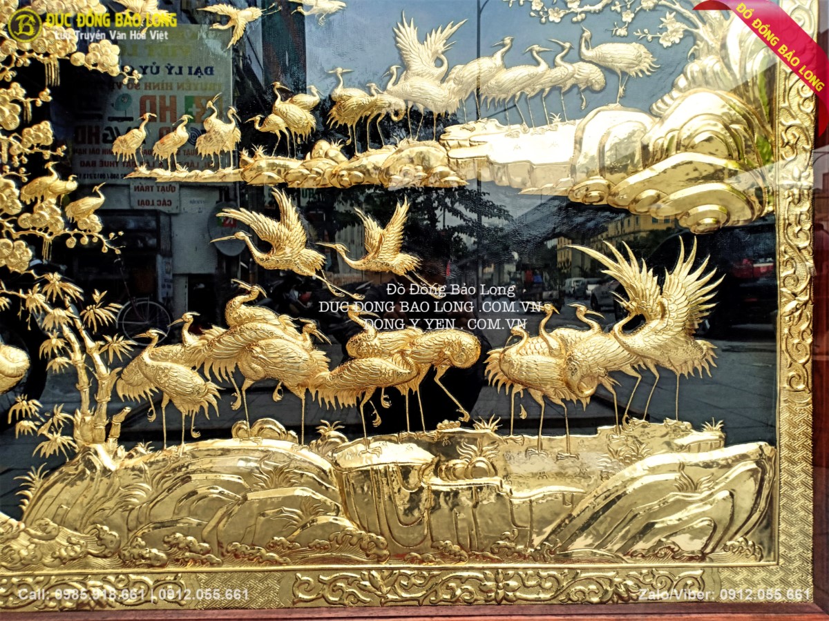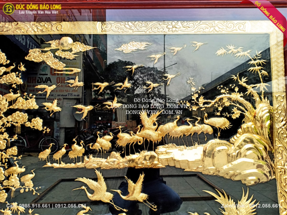 Tranh bách hạc quần tùng bằng đồng mạ vàng 24k cực đẹp