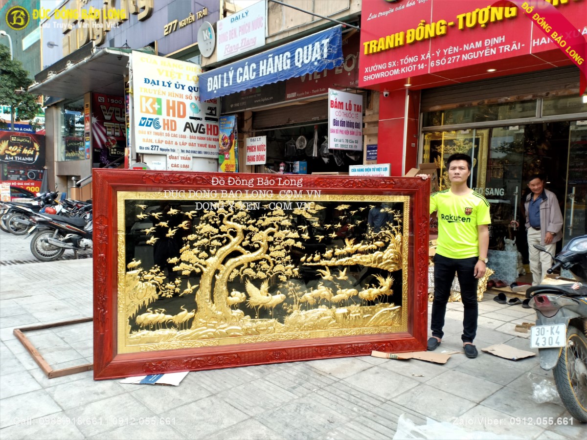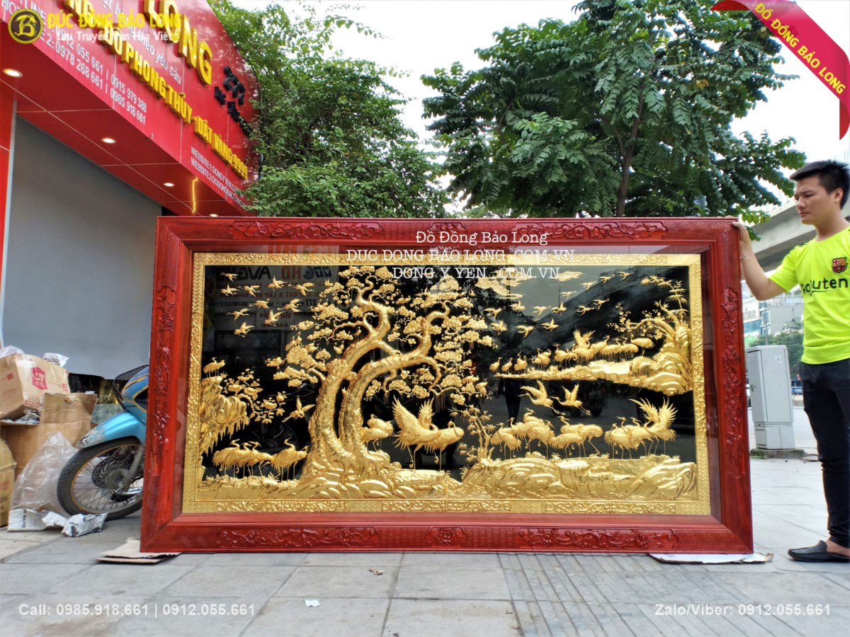 Tranh bách hạc quần tùng mạ vàng 24k khổ 2m62 vừa được cơ sở Đúc Đồng Bảo Long hoàn thiện. Tranh có chiều dài 2m61, cao 1m55, lòng tranh được chế tác hoàn toàn thủ công từ đồng dày 8rem nhập khẩu Hàn Quốc, chạm tay thủ công cho đường nét tinh xảo, sau đó được mạ phủ vàng ròng 24k bằng phương pháp điện phân nhúng bể cao cấp nhất hiện nay cho màu sắc và độ bền cực cao. Khung tranh được làm từ gỗ hương đục tứ quý vô cùng tỉ mẩn đẹp mắt. Tranh rất thích hợp treo tại phòng khách có không gian rộng, chắc chắn sẽ rất sang trọng và đẳng cấp.