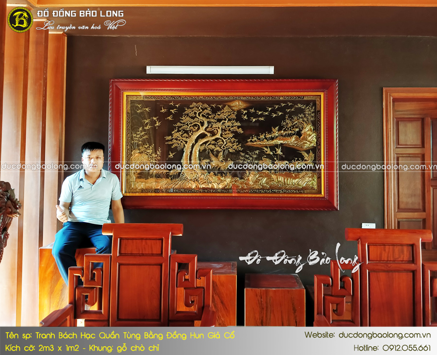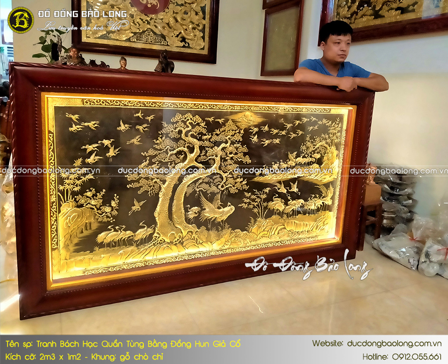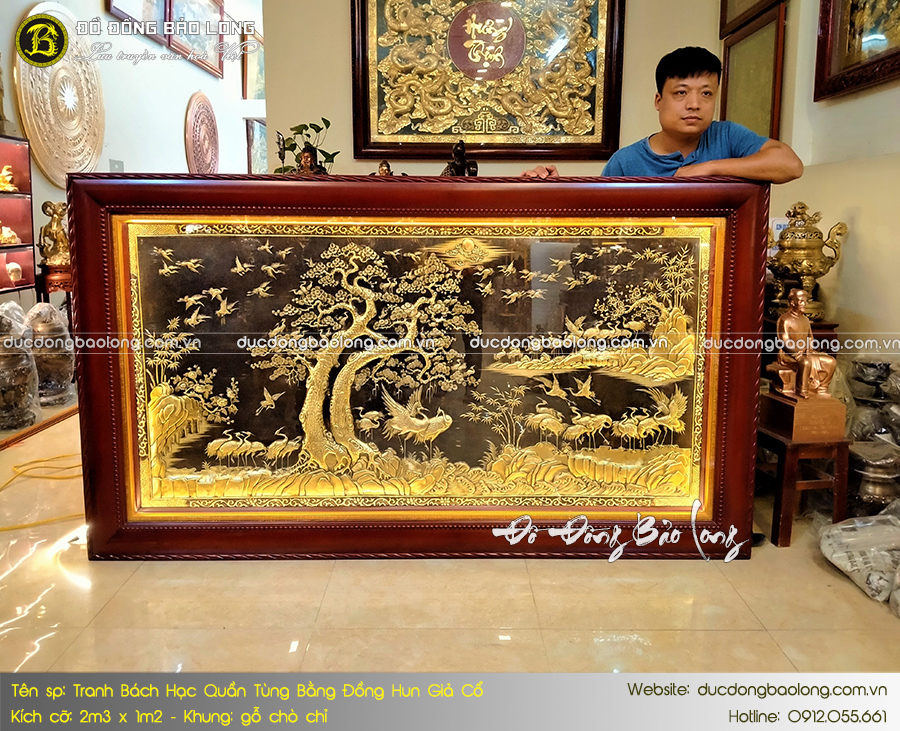 Bức tranh Bách Hạc Quần Tùng 2m3 x 1m2 mang những nét cải tiến mới trong ngành chế tác tranh đồng thủ công mỹ nghệ. Đó là bề mặt tranh được tạo màu hun giả cổ độc đáo càng làm nổi bật màu vàng mộc của các chi tiết còn lại. Tác phẩm với chủ đề 100 con hạc quần tụ bên đôi cây tùng mang ý nghĩa tượng trưng cho may mắn, bình an và gặp nhiều điều tốt đẹp trong cuộc sống.