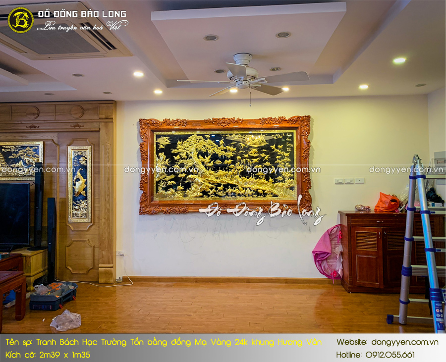 Tranh Bách Hạc Trường Tồn khung gỗ hương mạ vàng 2m39 x 1m35 là sản phảm mới nhất của chúng tôi chế tác cho khách hàng. Bức tranh được chế tác thủ công bởi các nghệ nhân lâu năm, màu sắc vàng nền đen. Tranh đồng sử dụng khung gỗ hương vân cao cấp. Cùng với vẻ đẹp và ý nghĩa may mắn, đây là lựa chọn được rất nhiều người yêu thích treo trong nhà hay phòng làm việc.