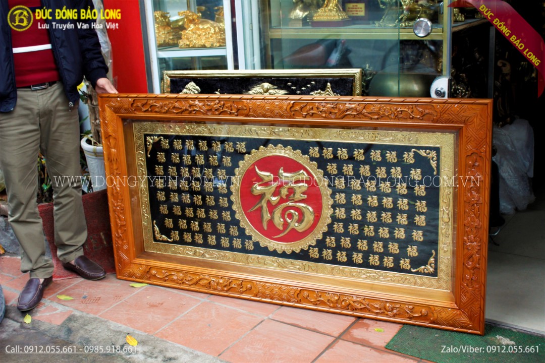 Tranh bách Phúc 1m27 thường được trang trí treo tại phòng khách, phòng làm việc có diện tích không gian nhỏ hẹp. Đây là một trong những mẫu tranh chữ Phúc rất đẹp được các nghệ nhân Bảo Long kỳ công chế tác. Mọi công đoạn được chúng tôi chạm hoàn toàn thủ công từ đồng vàng dày 8rem, khung gỗ gụ 1m27 x 61cm. Tranh được chạm 99 chữ Phúc nhỏ và 1 chữ Phúc lớn ở chính giữa. Toàn bộ chữ được chạm bằng chữ Nho. Mọi chi tiết được chạm kỹ lưỡng, sắc nét và tinh xảo nhất.