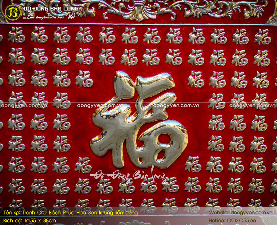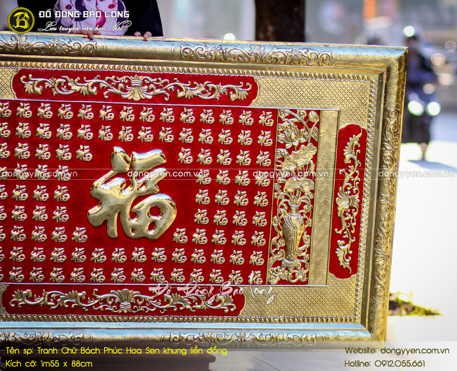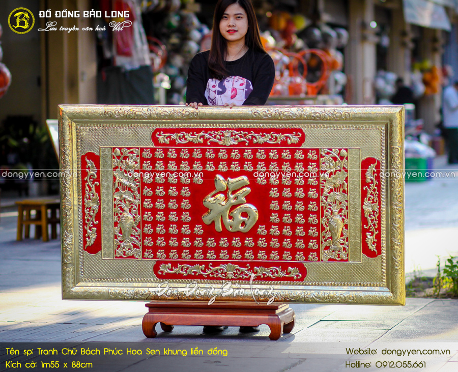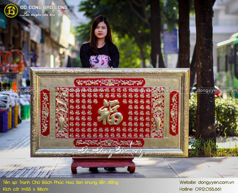 Tranh Bách Phúc Hoa sen khung liền đồng 1m55 x 88cm có vẻ ngoài độc đáo, ý nghĩa. Tục lệ treo tranh chữ trong nhà của người Việt đã có từ lâu. Trong đó, các chữ như Phúc, Lộc, Thọ được sử dụng nhiều nhất. Hoa sen cũng được coi là Quốc hoa của Việt Nam. Bức tranh được chế tác bằng đồng, kiểu dáng sang trọng, bắt mắt. Tranh Bách Phúc thích hợp treo phòng khách, phòng thờ...