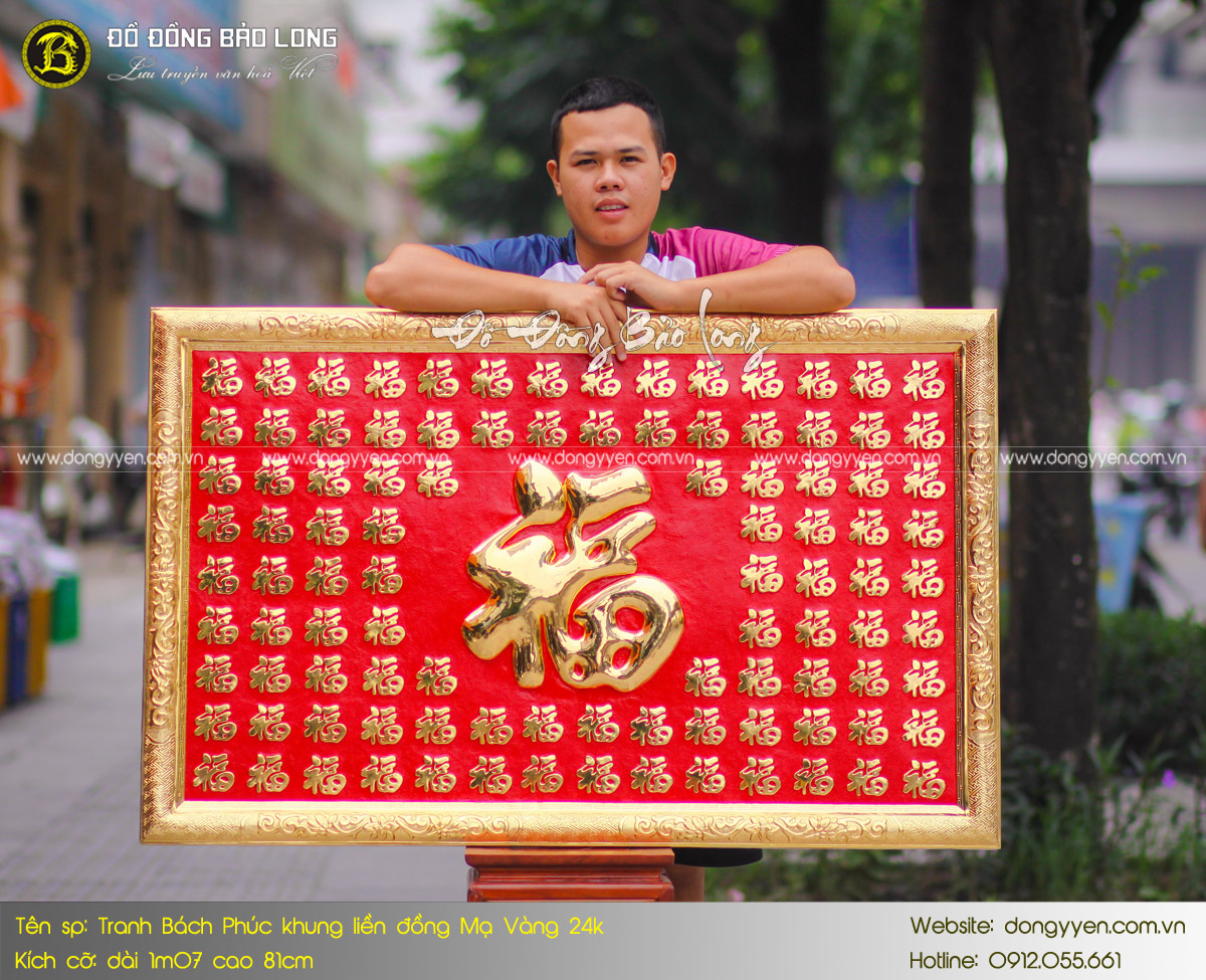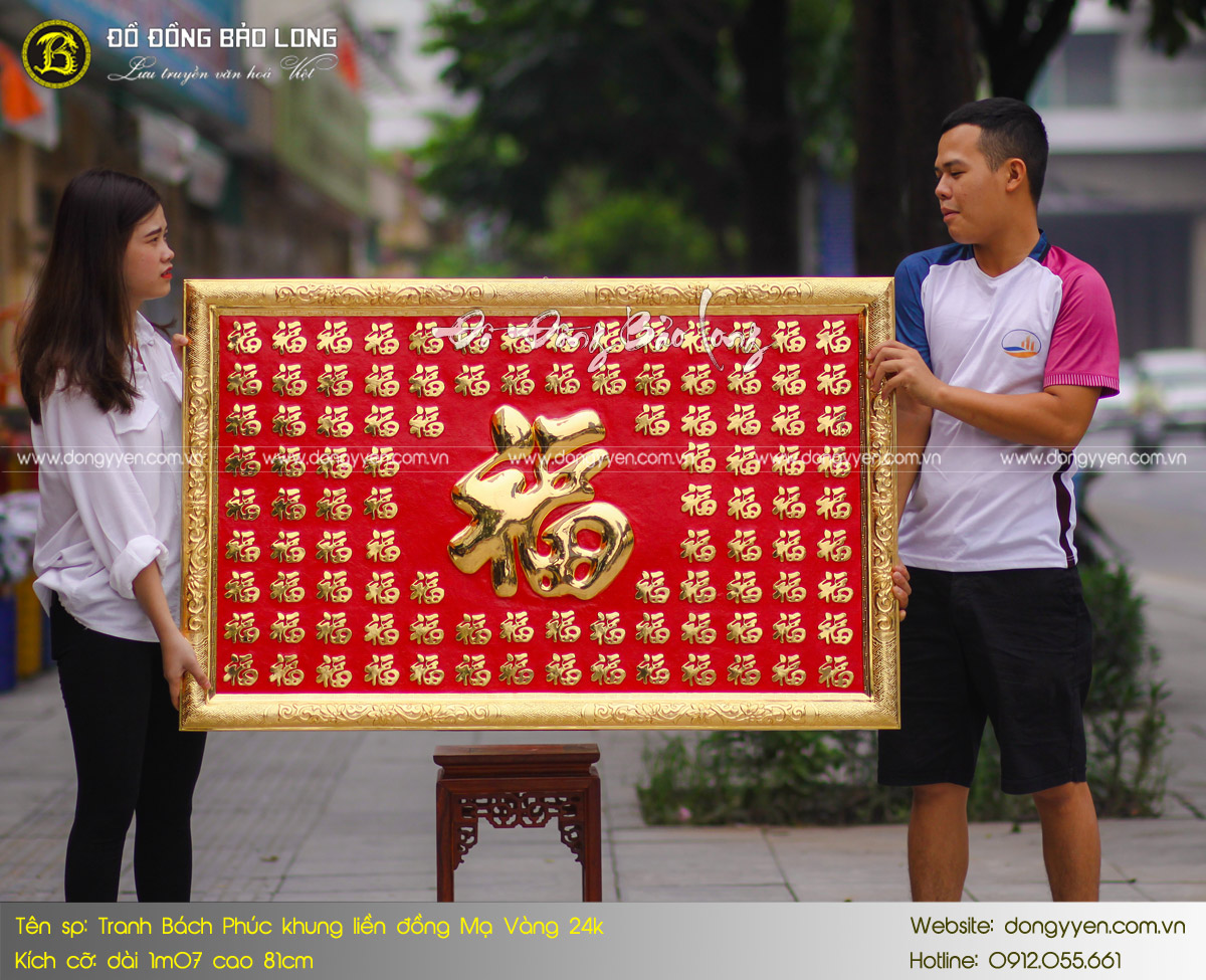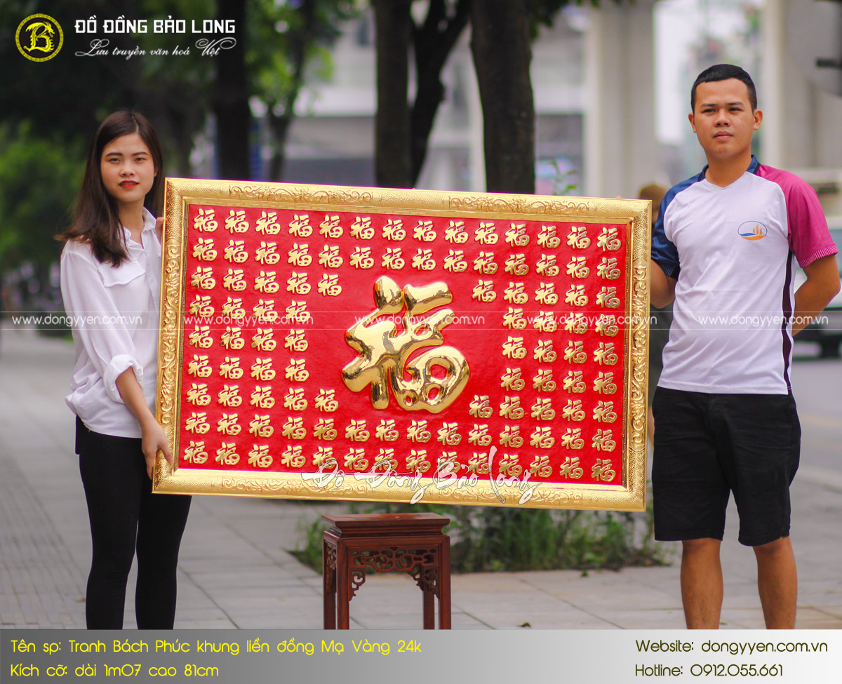 Tranh Bách Phúc khung liền đồng mạ vàng 24k 1m07 x 81cm có vẻ ngoài độc đáo, ý nghĩa. Các chữ như Phúc, Lộc, Thọ được người Việt ưa chuộng và sử dụng nhiều nhất. Bức tranh được chế tác bằng đồng, kiểu dáng sang trọng, bắt mắt. Tranh Bách Phúc thích hợp treo phòng khách, phòng thờ...
