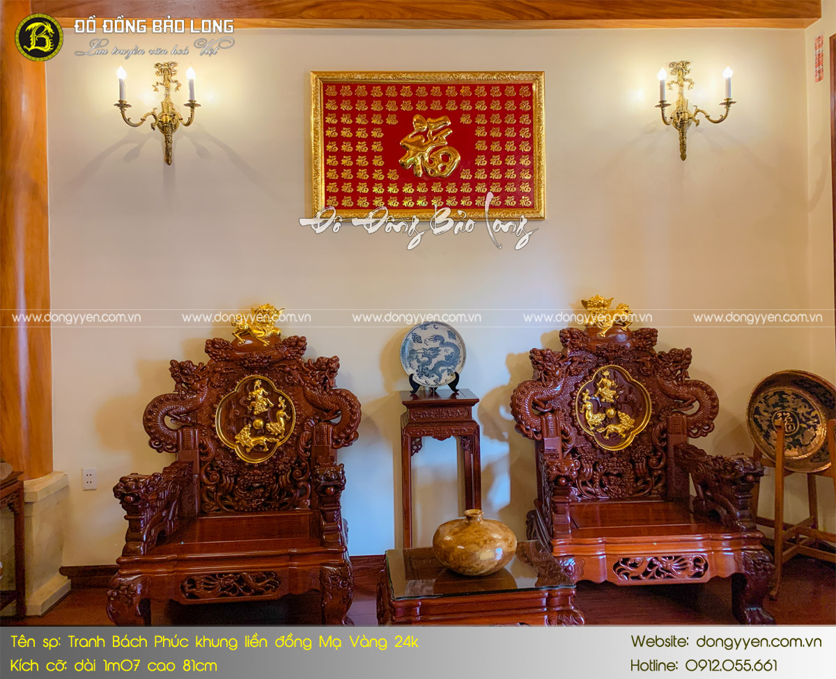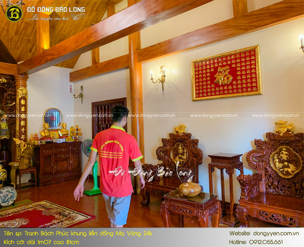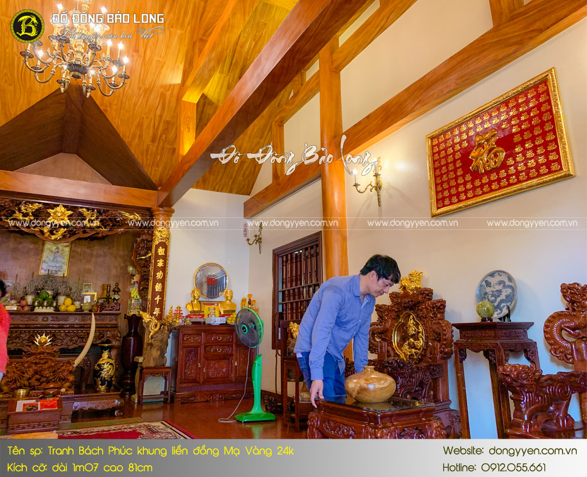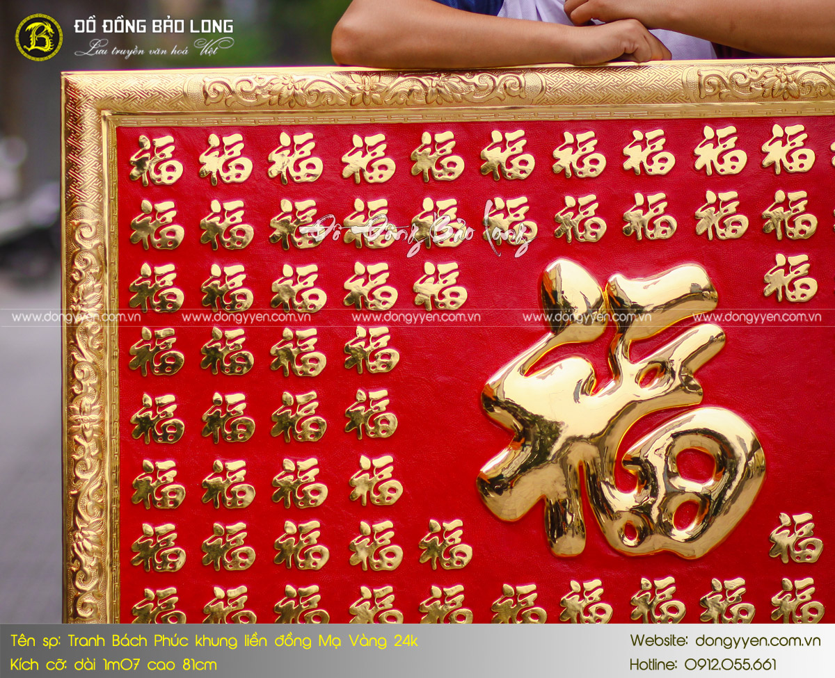 Tranh Bách Phúc khung liền đồng mạ vàng 24k 1m07 x 81cm có vẻ ngoài độc đáo, ý nghĩa. Các chữ như Phúc, Lộc, Thọ được người Việt ưa chuộng và sử dụng nhiều nhất. Bức tranh được chế tác bằng đồng, kiểu dáng sang trọng, bắt mắt. Tranh Bách Phúc thích hợp treo phòng khách, phòng thờ...