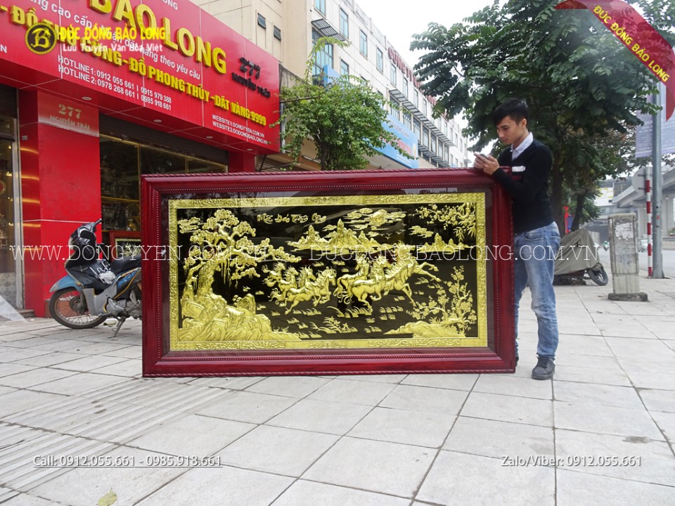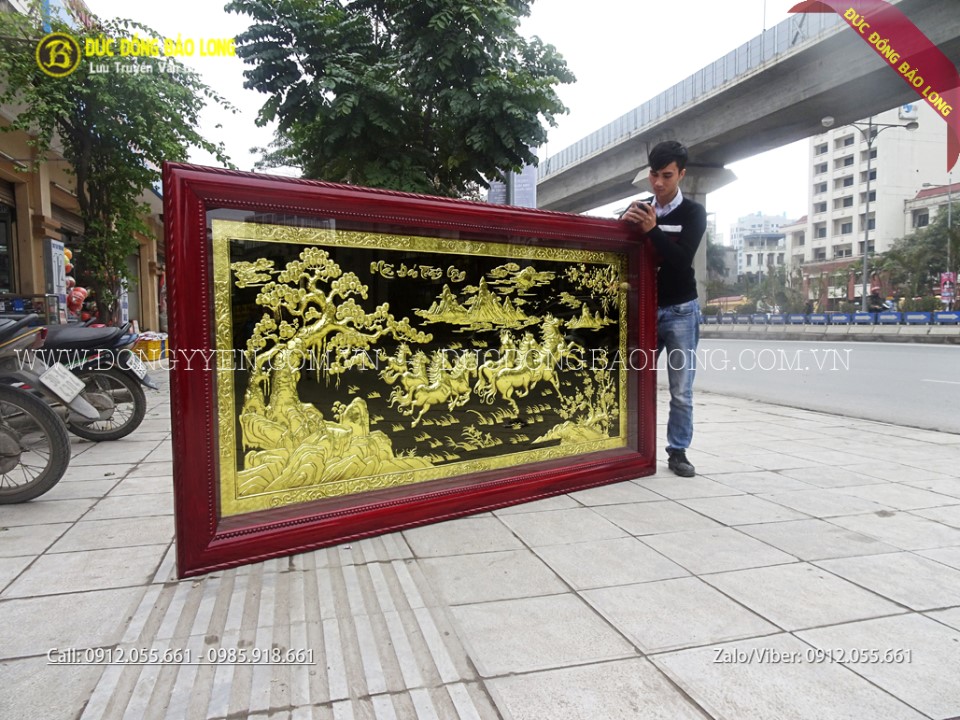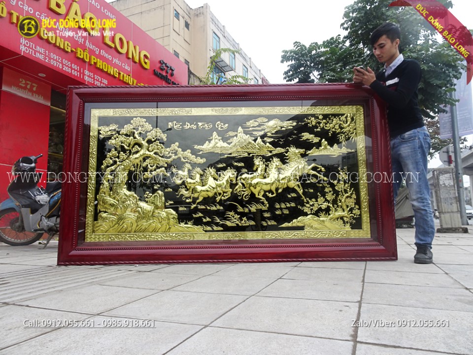 Tranh bát mã bằng đồng khung gỗ hương khổ 2m31 hay còn gọi là tranh mã đáo thành công theo đơn đặt hàng của khách ở Nghệ An. Tranh được chạm hoàn toàn thủ công từ nguyên liệu đồng vàng nguyên tấm dày 8rem, khung gỗ hương cao cấp đục mắt ngọc tuyệt đẹp. Tranh được hoàn thiện hết sức kỹ càng, tỉ mỉ và giao hàng tận nơi cho khách hàng ở Nghệ An.