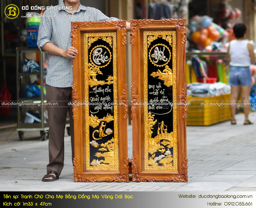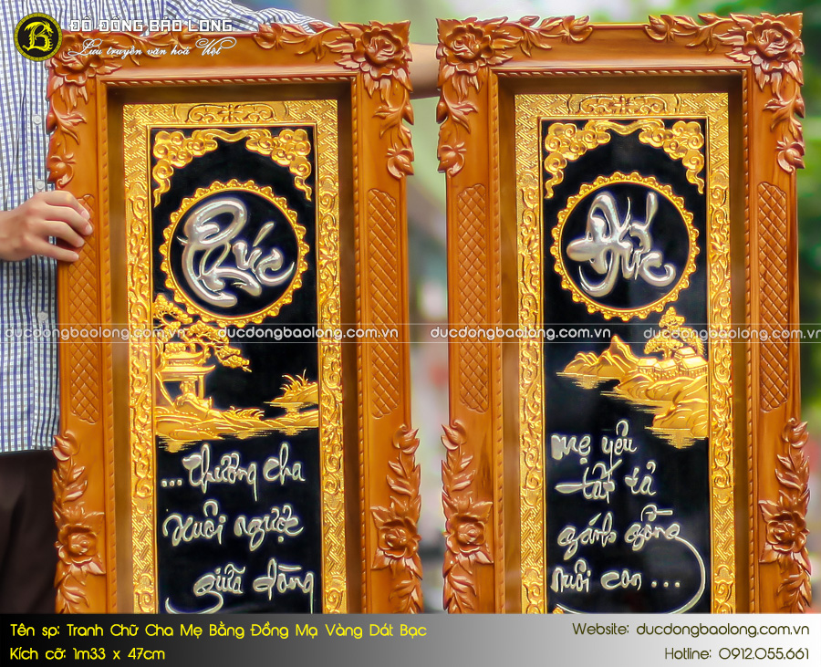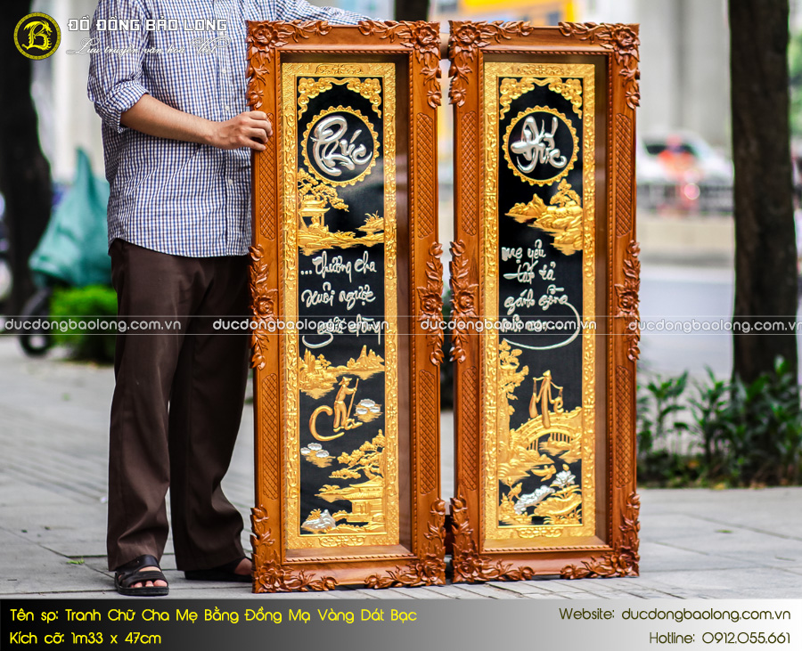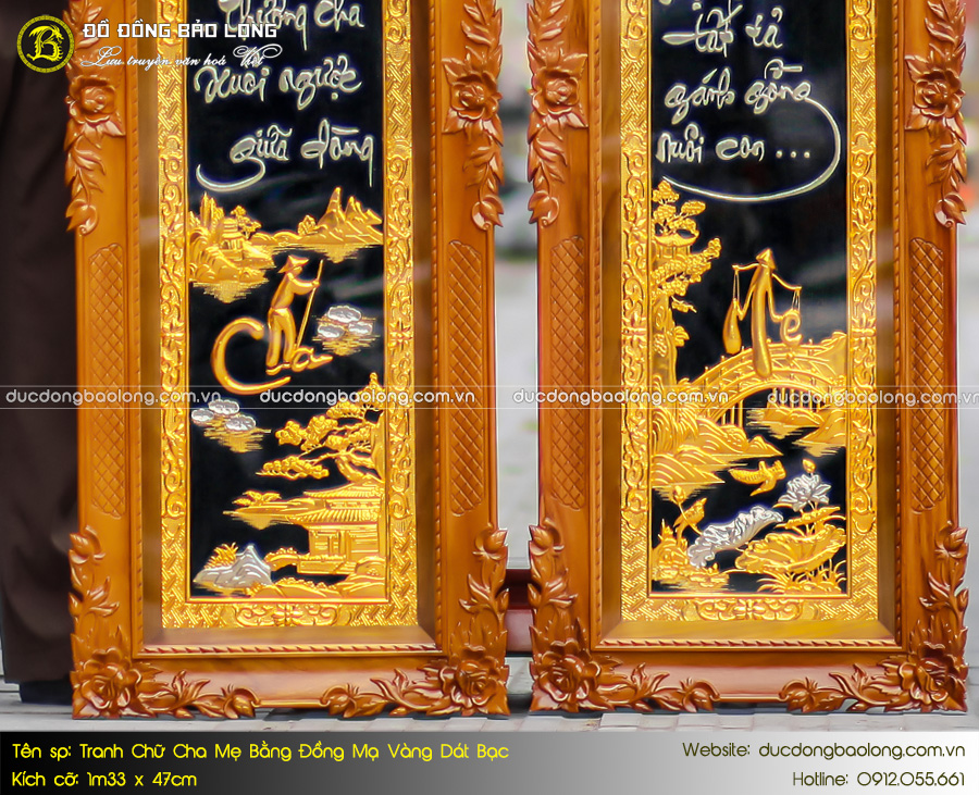 Mẫu tranh chữ Cha Mẹ bằng đồng mạ vàng dát bạc 1m33 được chế tác theo yêu cầu khách hàng, thể hiện thông điệp ý nghĩa, nói lên tấm lòng hiếu thảo của người con đối với đấng sinh thành. Bức tranh mang màu sắc nhã nhặn nhưng không kém phần sang trọng, nổi bật bởi các chi tiết hoa văn sắc nét kết hợp mạ vàng, dát bạc đẳng cấp.